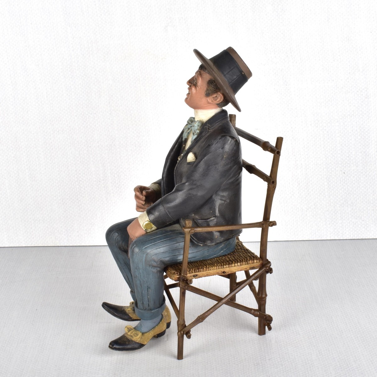 Antique Terra-Cotta Figurine of a Well Dressed Gentleman Seated in a Bamboo Chair. Impressed markers mark to bottom of figure. Circa 1940. Measures: 9-1/4" H, 5" W, 5" D. Condition: Good condition, shoes have been professionally repaired. Estimate: $300.00 - $500.00 Domestic Shipping: $88.00