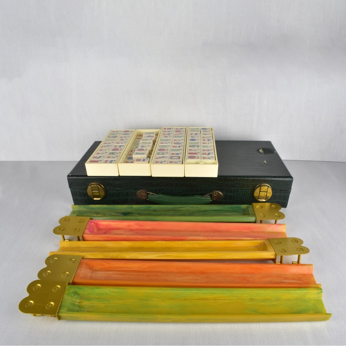 Vintage Crisloid Mahjong Set with Tiles and Racks in Faux Green Alligator Box. One hundred fifty two (152) tiles, five (5) racks. Rackes measure: 18-3/4" L. Provenance: Estate of Jacqueline Kott, Miami, Florida. Condition: Overall good condition, we did not examine each piece, all components appear present. Estimate: $50.00 - $100.00 Domestic Shipping: Third party.