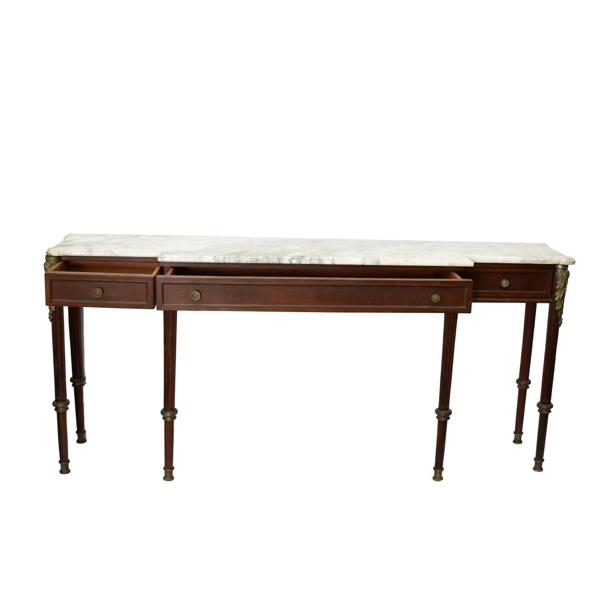 Long French Marble Top Side Board. Three drawer, bronze mounts, white scroll marble. Measures 35" H x 77" L x 17" W. Condition: Good used condition, some light scratching. Estimate: $300.00 - $600.00 Domestic Shipping: Third Party