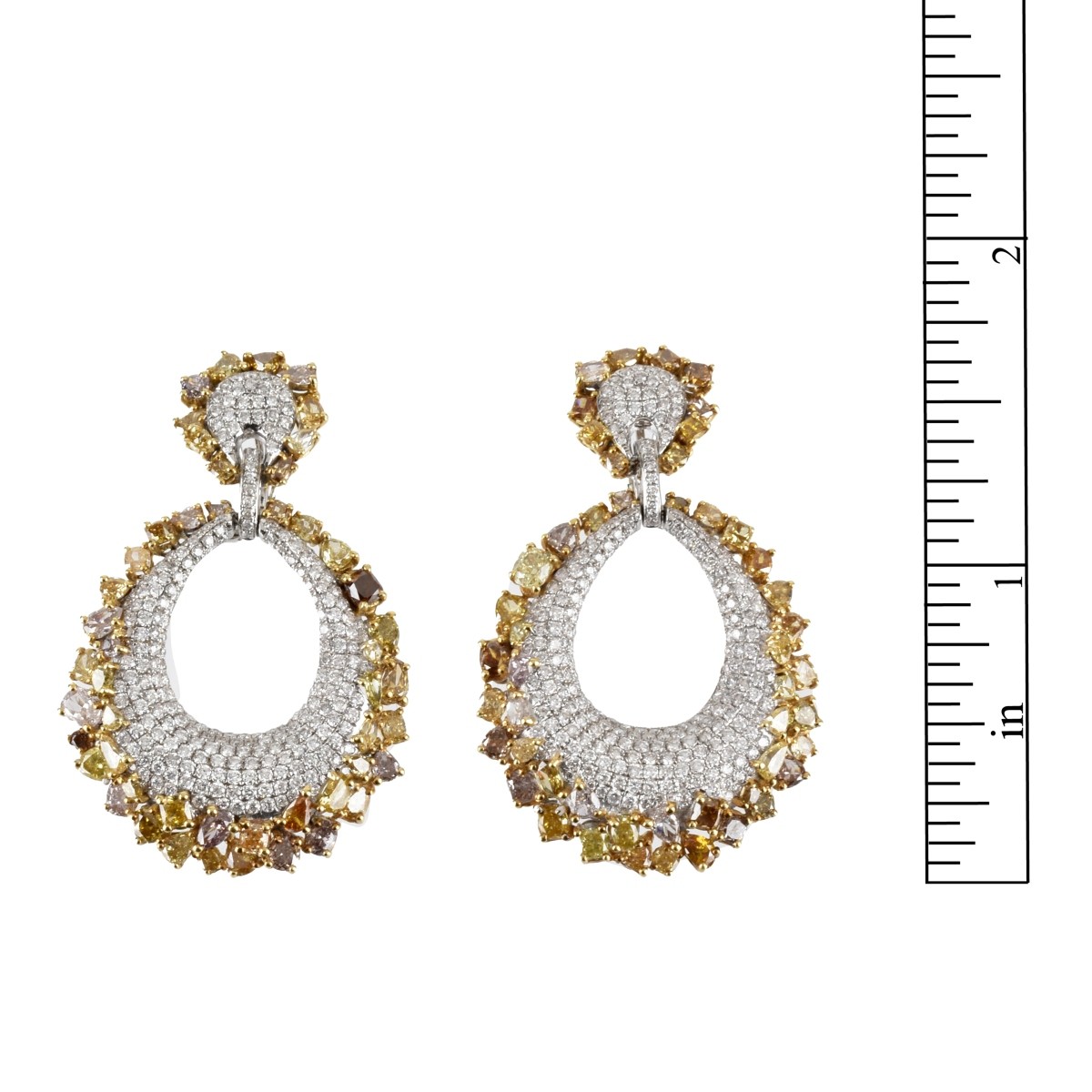 10.30 Carat TW One Hundred Multi-cut Multi Fancy Color Diamond, 4.32 Carat TW Round Brilliant Cut High Quality White Diamond and 18 Karat White and Yellow Gold Pendant Earrings. Fancy diamonds VS-SI clarity. White diamonds E color, VS clarity. Stamped 18K. Measure 2" L, 1-1/4" W. Approx. weight: 26.48 grams. Condition: Very good condition. For additional information and/or WhatsApp video please contact our resident GIA Graduate Gemologist, Russ Kodner at 954.650.5030 Estimate: $12,000.00 - $15,000.00 Domestic Shipping: $40.00