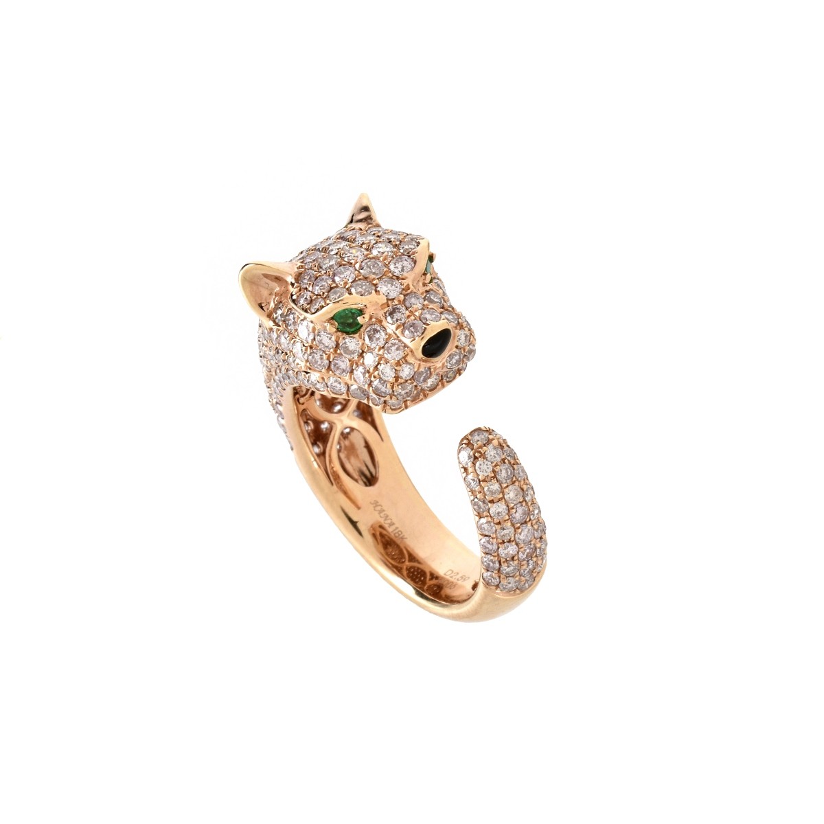 2.59 Carat TW Pave Set Fancy Pink Diamond and 18 Karat Pink Gold Panther Ring Accented with Emerald Eyes and Enamel Nose. Diamonds VS1 clarity. Stamped 18K. Ring size 6-1/2. Approx. weight: 9.53 grams. Condition: Very good condition. For additional information and/or WhatsApp video please contact our resident GIA Graduate Gemologist, Russ Kodner at 954.650.5030 Estimate: $4000.00 - $6000.00 Domestic Shipping: $40.00