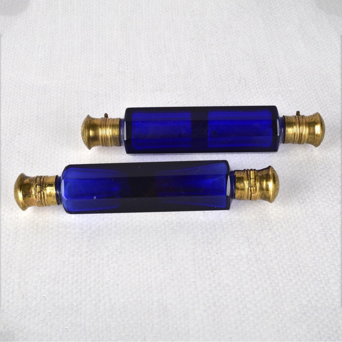 Two (2) Cobalt Blue Double Ended Scent Beveled Glass Bottles. Both ends with brass hinge caps with interior glass stoppers. 19th century. Measures: 5-1/2" L, 1-1/8" Dia.Provenance: Estate of Jacqueline Kott, Miami, Florida. Condition: Very good condition, Estimate: $100.00 - $200.00 Domestic Shipping: $68.00