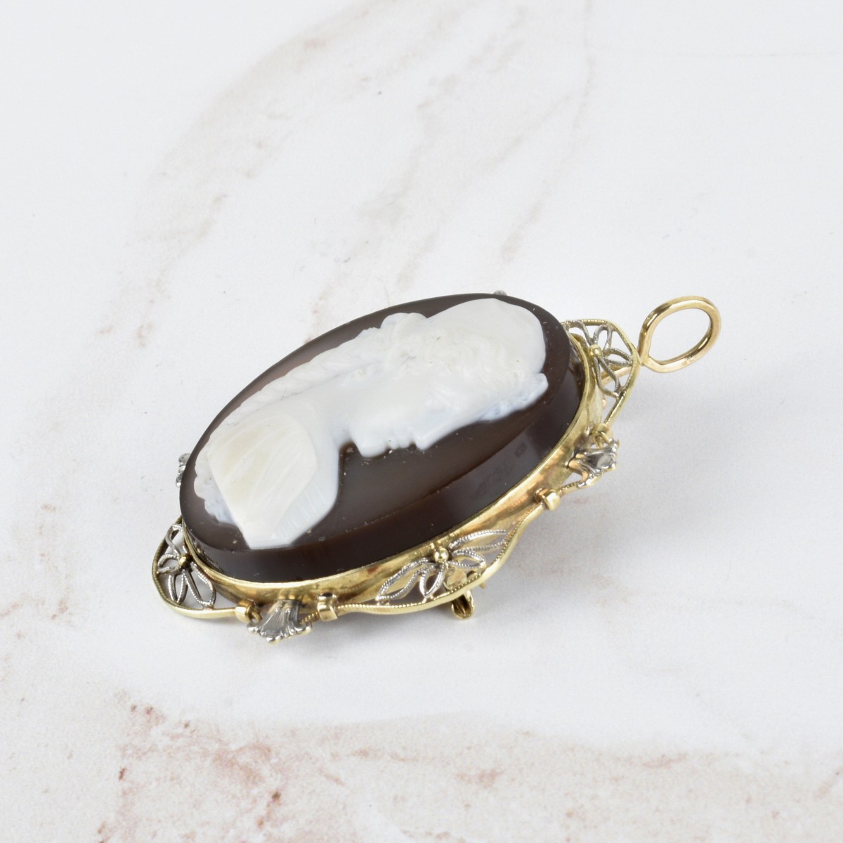 19th Century Victorian Finely Carved Agate Cameo and 14 Karat Filigree Yellow and White Gold Pendant / Brooch. Measures 1-3/4" L, 1-1/2" W. Approx. weight: 18.19 grams. Condition: Very good antique condition. Estimate: $800.00 - $1000.00 Domestic Shipping: $40.00