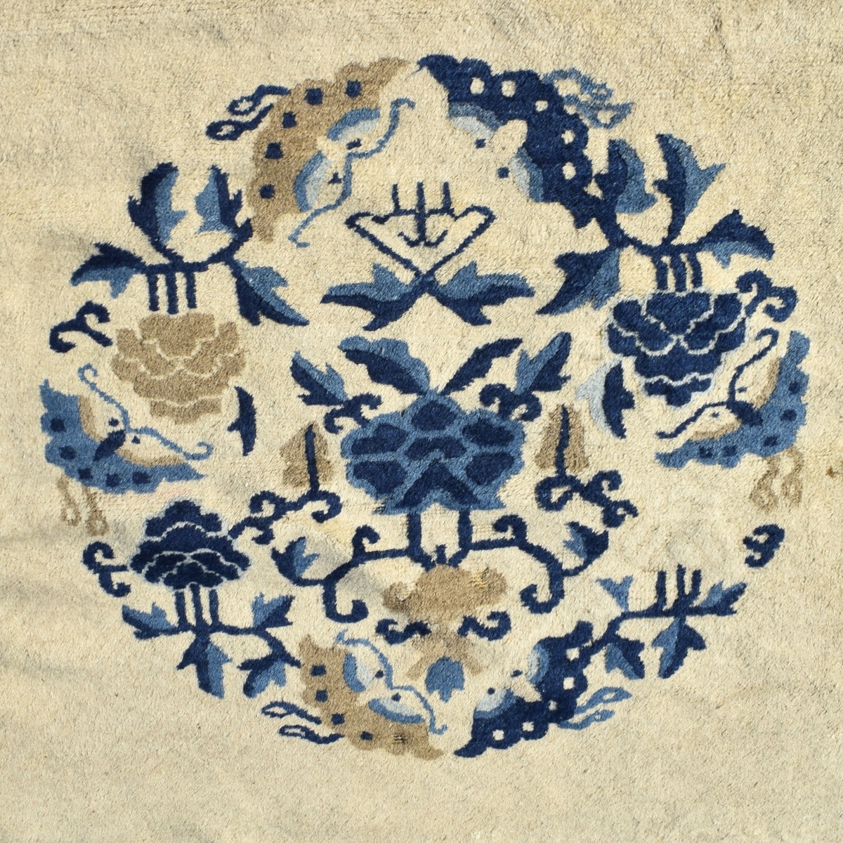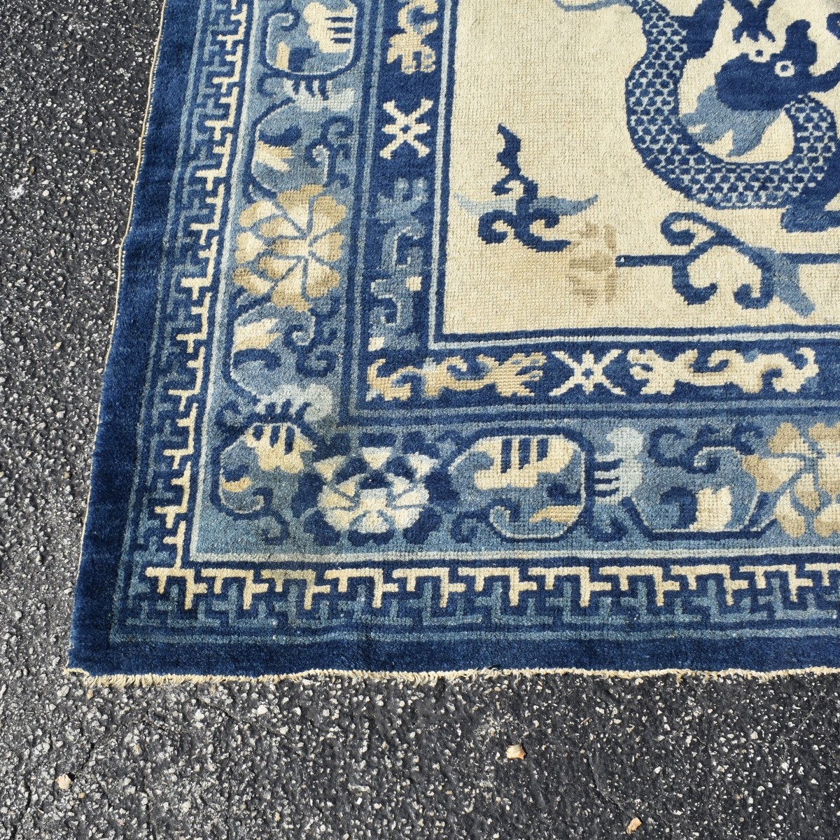 Vintage Chinese Blue and White Rug. Measures: 136" x 108". Condition: Needs a good cleaning, some wear. Estimate: $100.00 - $300.00 Domestic Shipping: Third party.