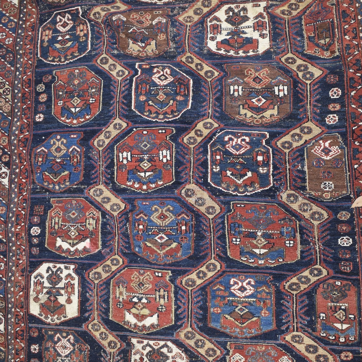 Semi-Antique Persian Shiraz Wool Rug. Measures: 81" x 58". Condition: Good used conditon, edge needs rebinding. Estimate: $100.00 - $300.00 Domestic Shipping: $75.00