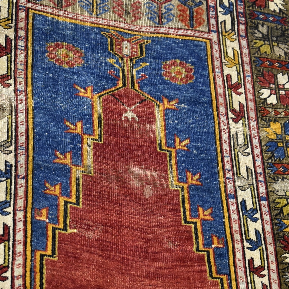 Semi-Antique Turkish Wood Prayer Rug. Measures: 75" x 48" Condition: Us condition, some fading and worn spots. Some old repairs. Estimate: $100.00 - $300.00 Domestic Shipping: $85.00