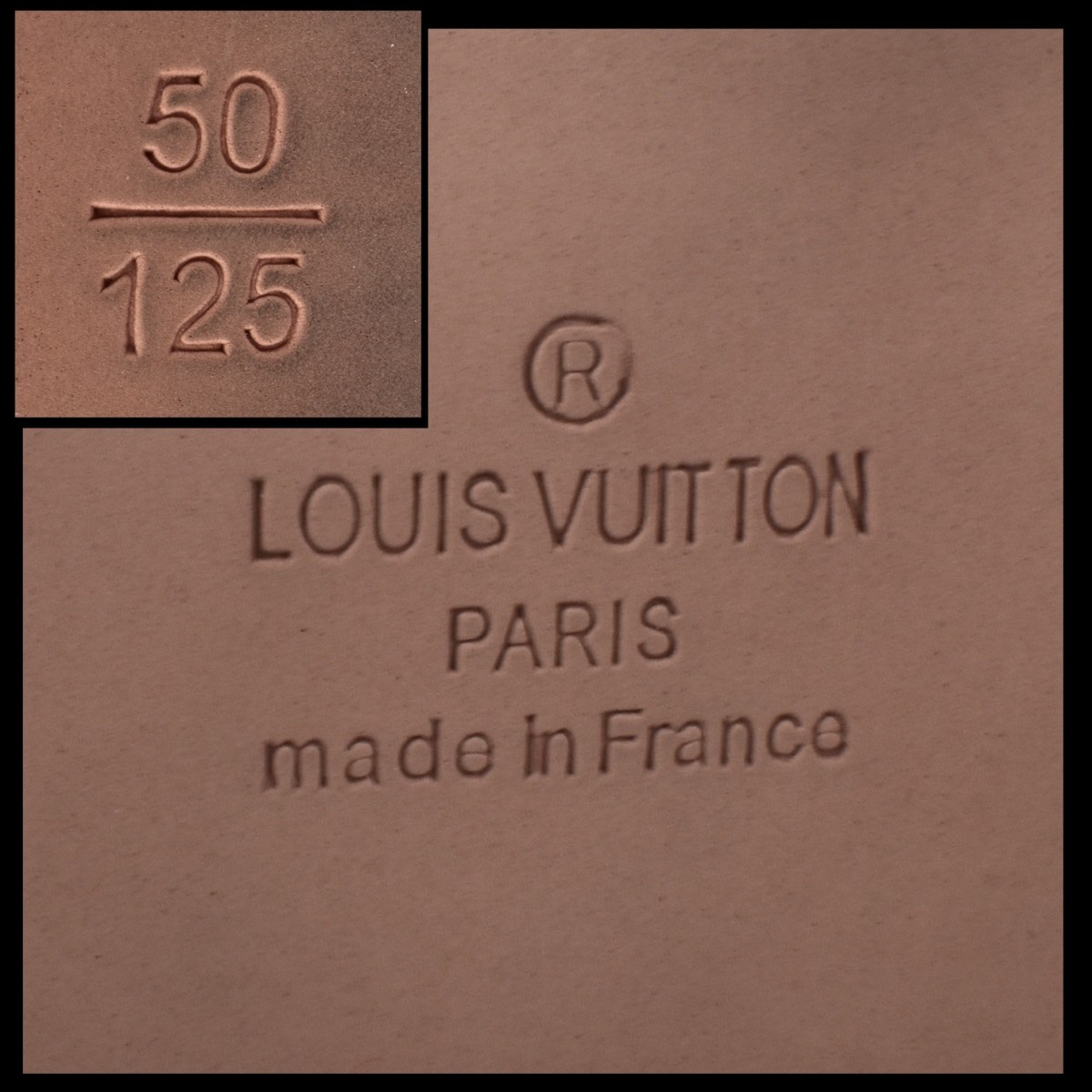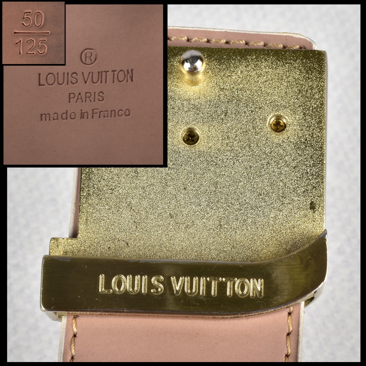 Louis Vuitton "Damier Azur" Leather Gold LV Initials Belt 50/125. Condition: Good used condition, additional holes punch to extend belt. Estimate: $100.00 - $200.00 Domestic Shipping: $42.00
