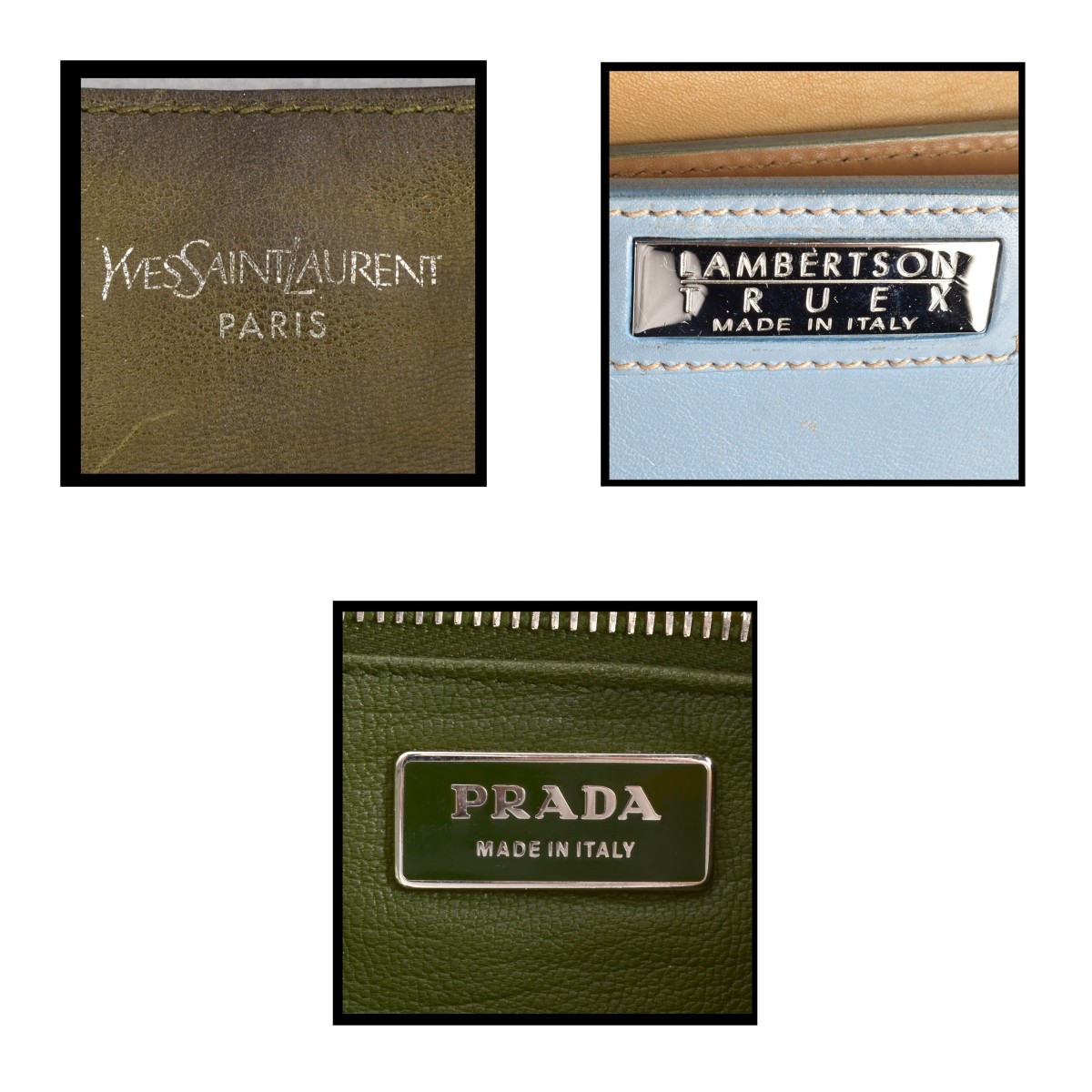 Collection of (3) Three Vintage Handbags. Consisting of (1) One Prada Green Python Handbag, (1) one Lambertson Truex handbag with coin purse, (1) one YSL green leather handbag. Prada bag measures: 12" H, 12-1/2" W, 4-1/2" W. Condition: Good vintage condition. Estimate: $100.00 - $200.00 Domestic Shipping: $76.00