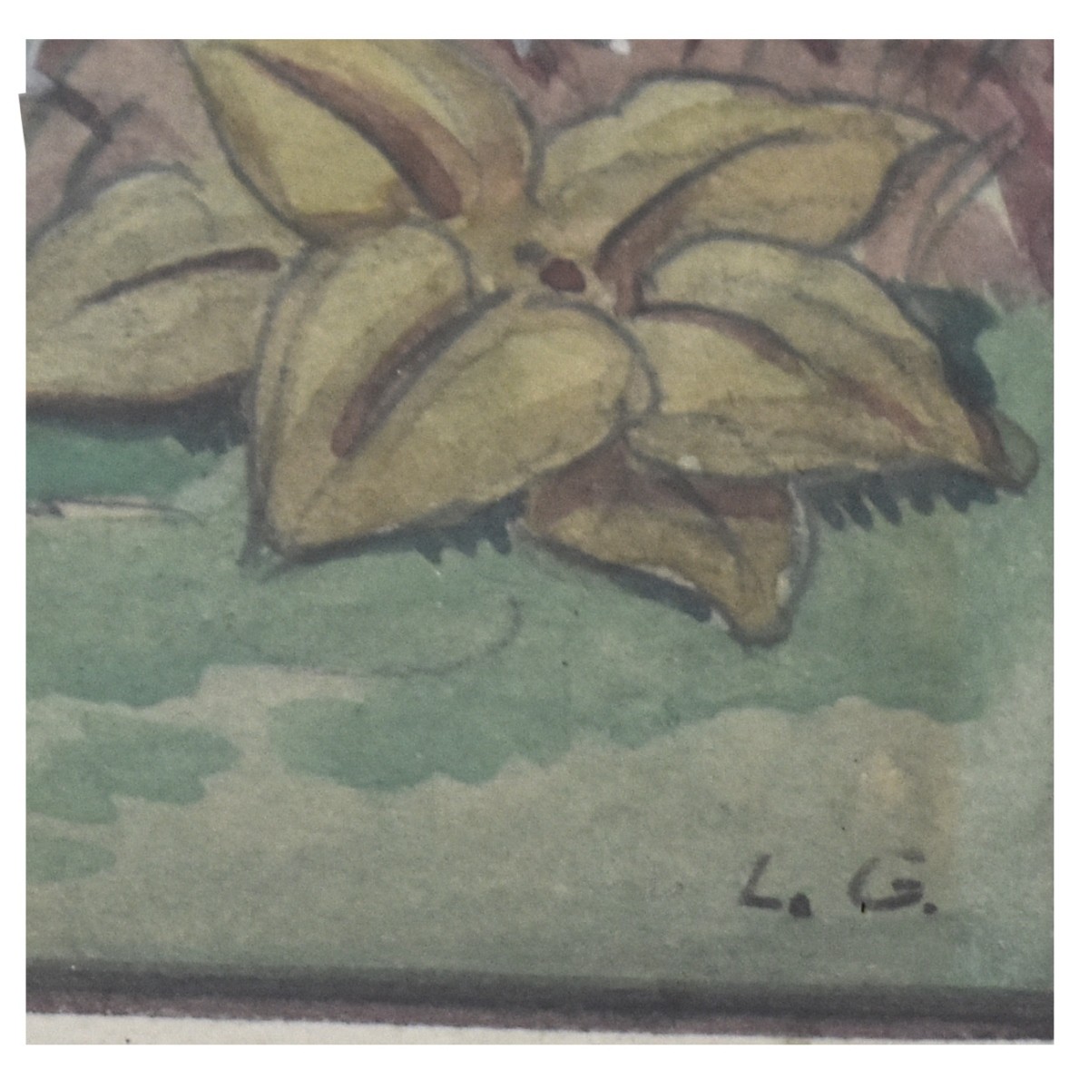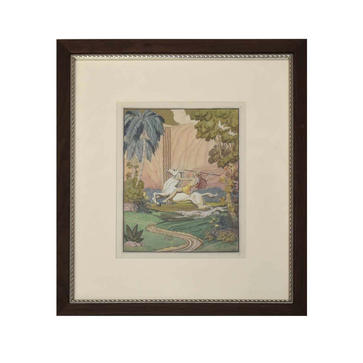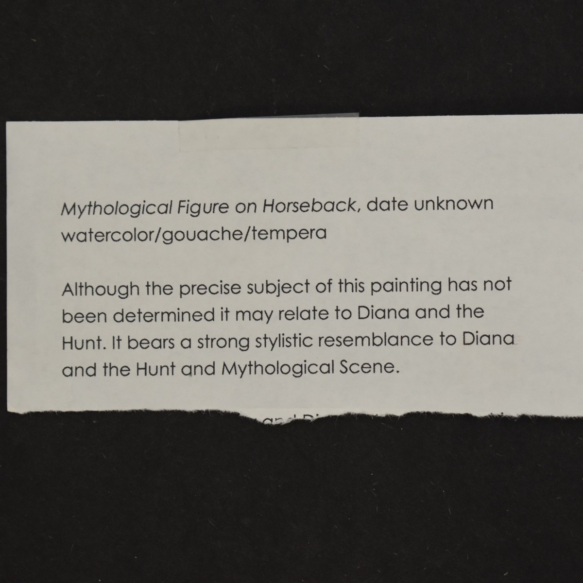 Watercolor /Gouache Female on Horseback. Although the precise subject of the painting has not been determined, it may relate to the Goddess Diana and the hunt mythological scene. Signed L.G. in the lower right hand corner. Over all measures: W, 18" H, 20" Condition: Good Condition. Estimate: $200.00 - $400.00 Domestic Shipping: $115.00