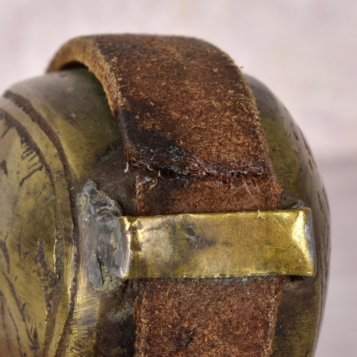 Ottoman Persian Bronze Gunpowder Flask with Leather Strap. Unsigned. Flask measures: 2-1/8" H x 2" W x 1" D. strap 6" L. Condition: Good used condition, some rubbing of the design to front and leather strap going through one loop is broken. Estimate: $50.00 - $150.00 Domestic Shipping: $42.00