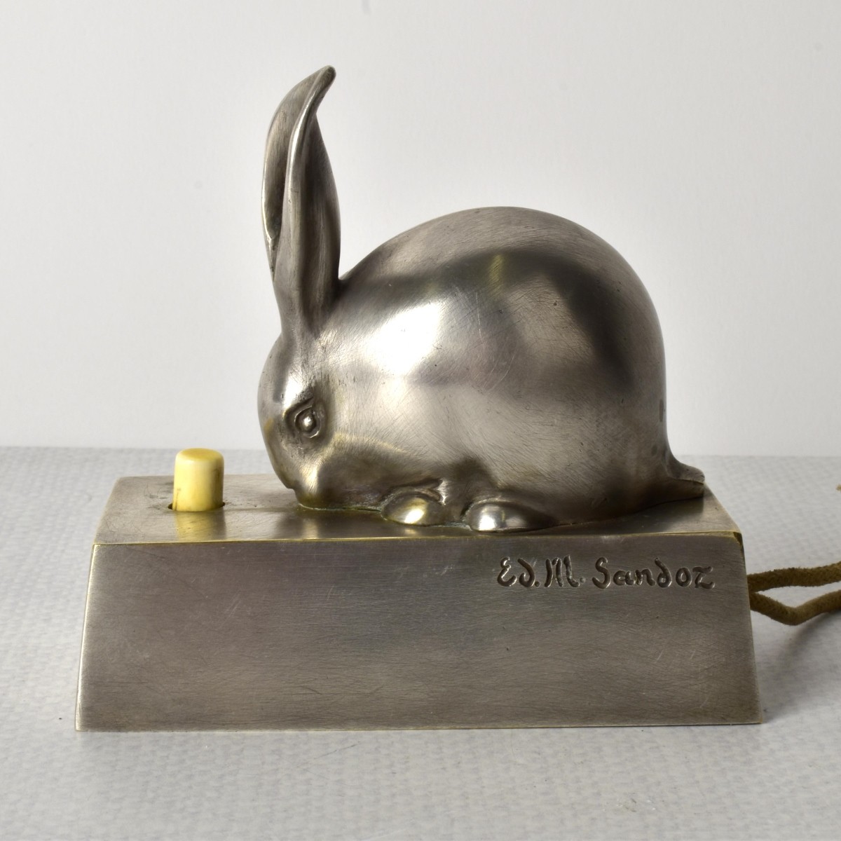 Edouard Marcel Sandoz, French (1880-1971) Silver on Bronze Rabbit Call Bell Susse Freres. Foundry, Paris France. Silver on bronze. Signed. Measure 2 3/4" L, 1 3/4" W, 3 3/4" H. Original wire still attached. Condition: Good condition. Light rubbing. Estimate: $2000.00 - $4000.00 Domestic Shipping: $62.00