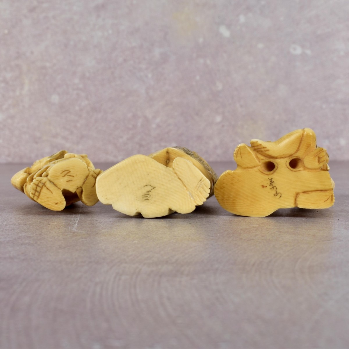 Four (4) Antique Japanese Figures. Consisting of one (1) standing Buddah attached to base, no visible signature, Buddah measures: 3" H, 2" W, 1-1/4" D., and three (3) polychrome figures, artist signed, tallest measures: 3" H, 1-1/4" W, 7/8" D. We Will Not Ship This Item Outside of the State of Florida. Anyone Having This Item Shipped Must Have a Florida Address or the Item will not be Shipped. We will Not Knowingly Sell Endangered Species outside of Legal Channels. Condition: Good condition. Estimate: $100.00 - $200.00 Domestic Shipping: $42.00 (Fl. only.)