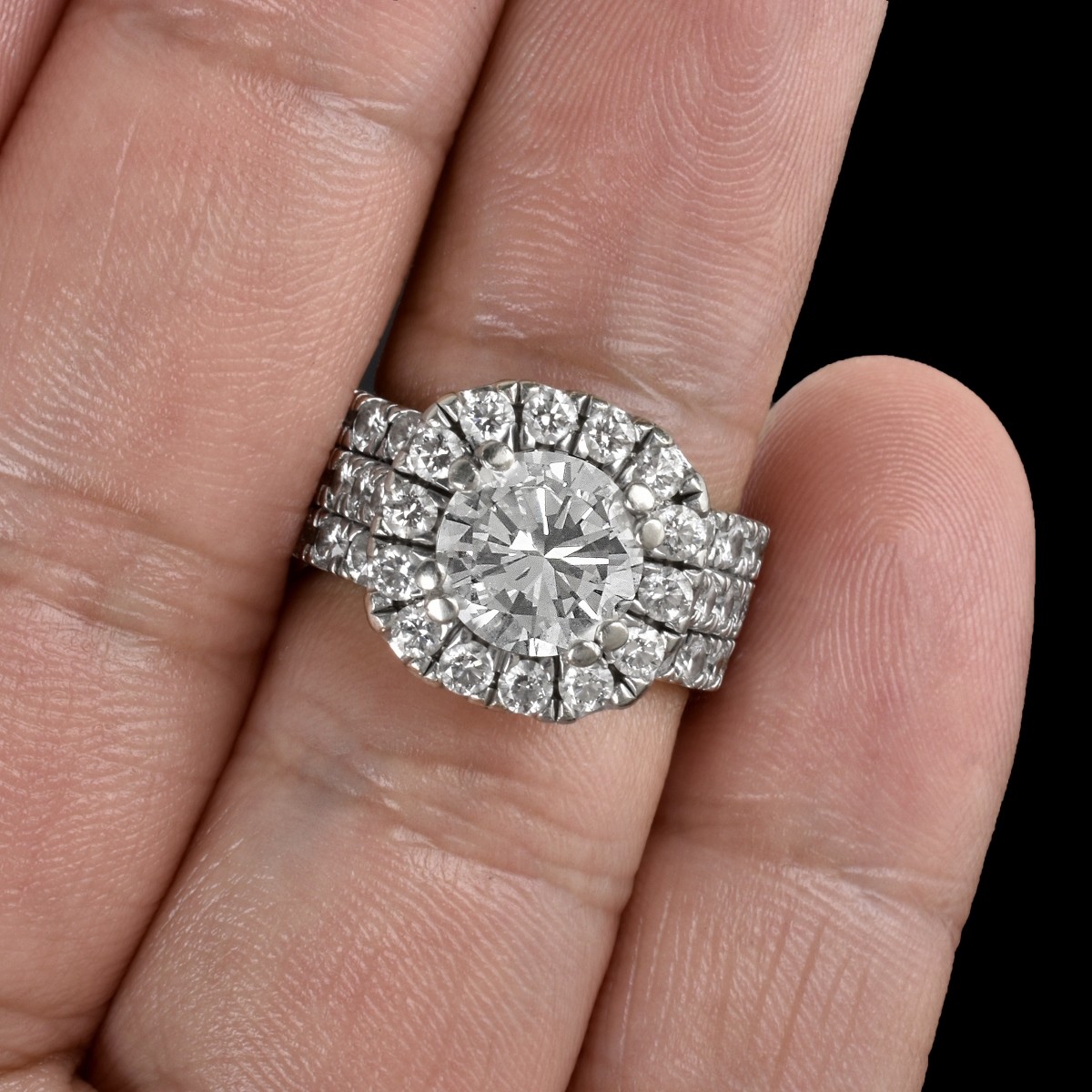 Vintage Approx. 4.47 Carat TW Diamond and 14 Karat White Gold Engagement Ring. Set in the center with approx. 2.22 carat round brilliant cut diamond, H-I color, SI1 clarity, measuring 8.7 x 8.7 x 4.8mm. Accented with approx. 2.25 carat TW forty-four round brilliant cut diamonds, G-H color, VS1-VS2 clarity. Stamped 14K. Ring size 5-3/4. Approx. weight: 11.86 grams. Condition: Very good condition. For additional information and/or WhatsApp video please contact our resident GIA Graduate Gemologist, Russ Kodner at 954.650.5030 Estimate: $10,000.00 - $15,000.00 Domestic Shipping: $40.00