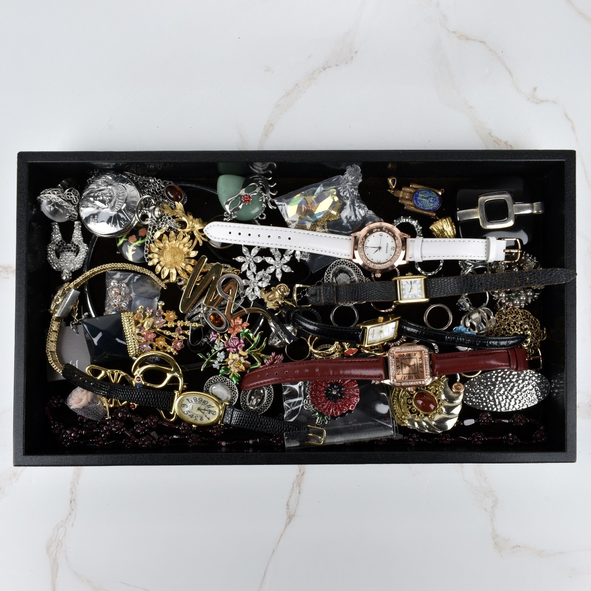 Box Lot of Fashion Jewelry. Large assortment of bracelets, necklaces, watches, earrings and brooches. Condition: Good condition. Please note the gallery does not warranty the running condition of watches. Estimate: $40.00 - $80.00 Domestic Shipping: $40.00