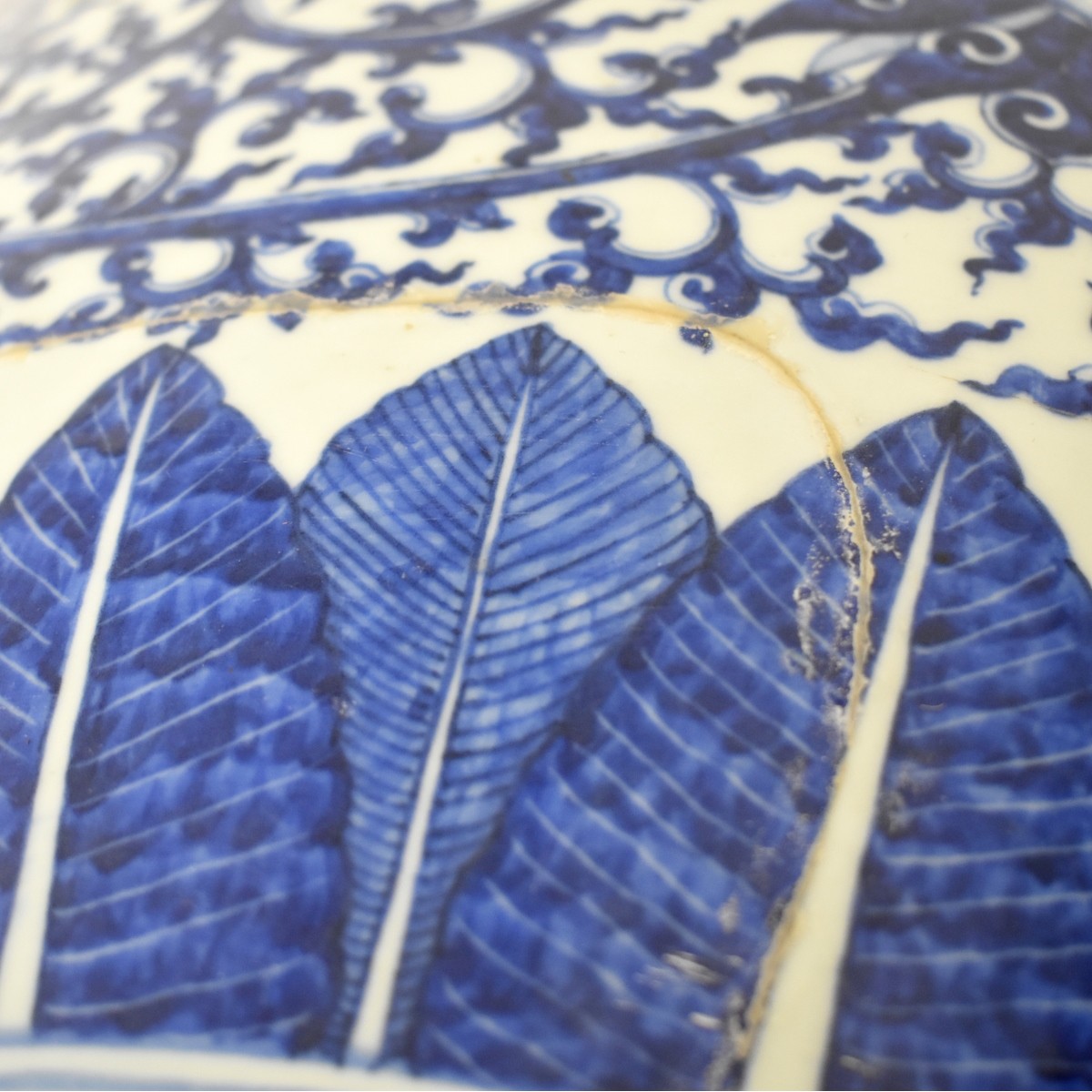 Large Antique Chinese Blue and White Porcelain Fish Bowl Jardiniere. 19/20th century. Measures: 19" H, 20-1/2" Dia. Condition: Scratch and minor firing flaws on exterior. Estimate: $700.00 - $900.00 Domestic Shipping: Third party.