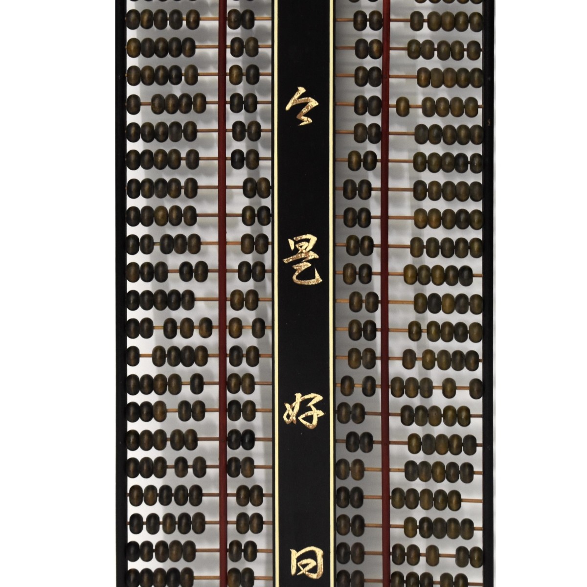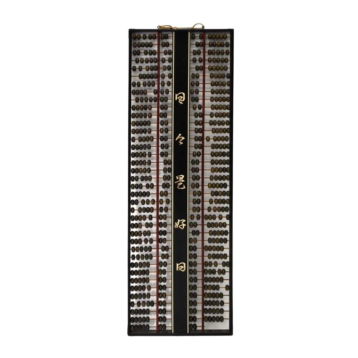 Wooden Chinese Suanpan Abacus, two sets of rows of five and two. Measures 38-1/4" H x 12" W 1" D. Condition: Good used condition, missing lower rung of 5 beads. Dusty. Estimate: $50.00 - $150.00 Domestic Shipping: $165.00