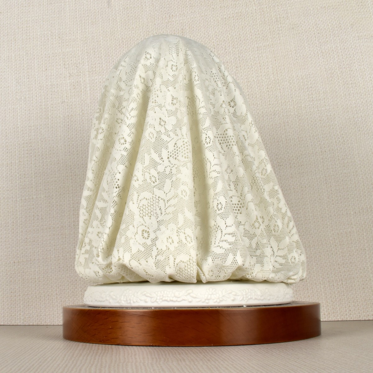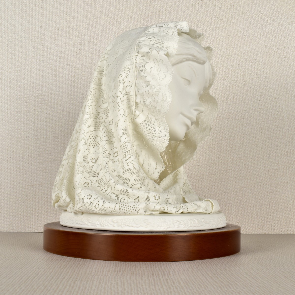 Lladro Bisque Figurine of a Lady's Bust with a Fine Lace Veil. Properly marked on the bottom and dated "1987". Overall with base measures: 9-1/2" H, 6-1/2" W, 7" D. Condition: Good conditon. Very minor pieces missing to the back of the veil. Estimate: $300.00 - $400.00 Domestic Shipping: Third party.