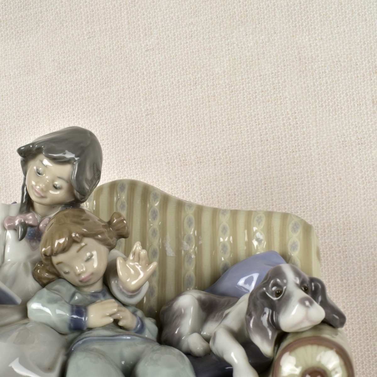 Lladro Figurine of Two Young Girls and a Dog Sitting on a Sofa Reading. Properly marked on the bottom. Measures: 6-1/2" H, 9" W, 6-1/2" D." Condition: Good condition. Estimate: $100.00 - $200.00 Domestic Shipping: $88.00