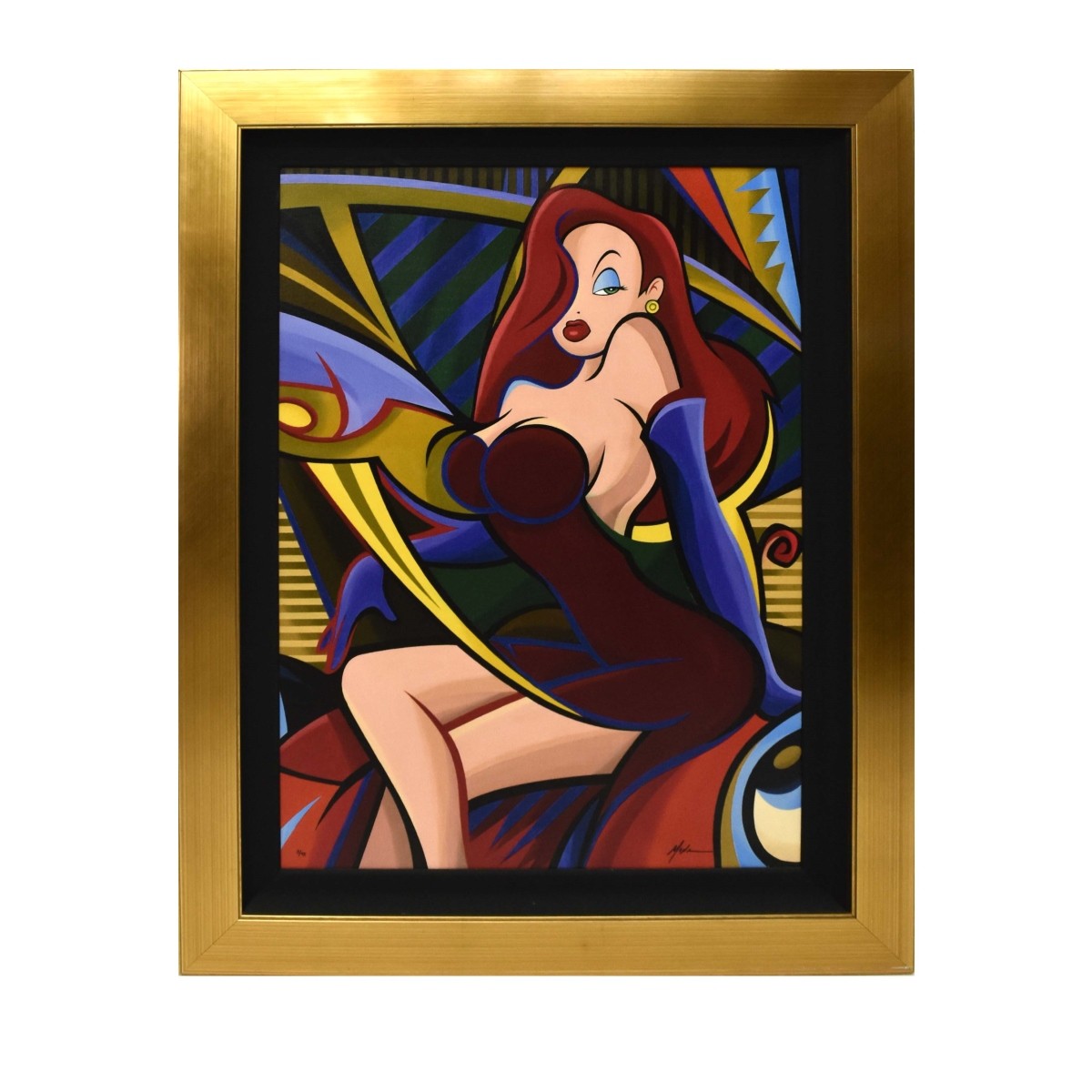 Jessica Rabbit Framed Giclee. Art deco inspired portrait of Jessica appearing to be seated on Benny the Cab. Limited edition 3/95. Viewing area measures: 32" H, 22-1/2" W, frame measures: 40-1/2" H, 31-1/2" W. Condition: Good condition. Estimate: $200.00 - $400.00 Domestic Shipping: Third party