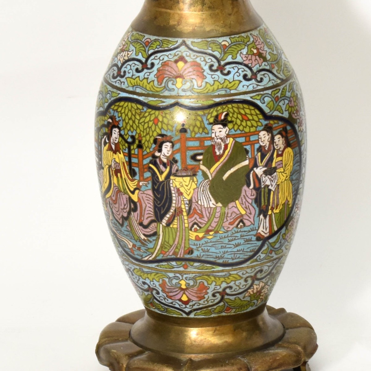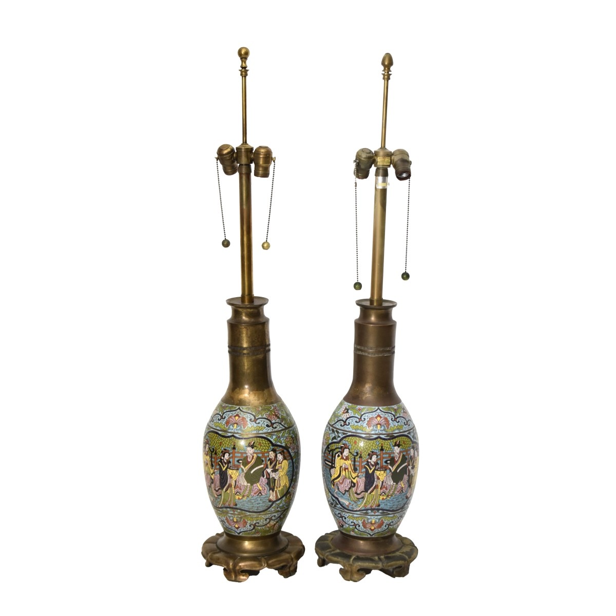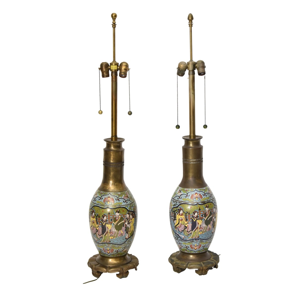 Pair of Marbro Cloisonne Lamps. Asian inspired mid- century modern brass lamps. Measures: 44"H., 8-1/2"W. Condition: Good vintage condition. One lamp needs the base reattached and socket needs replacing. Estimate: $100.00 - $300.00 Domestic Shipping: Third party