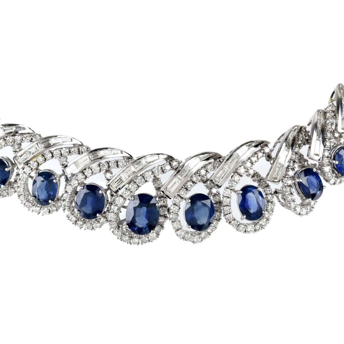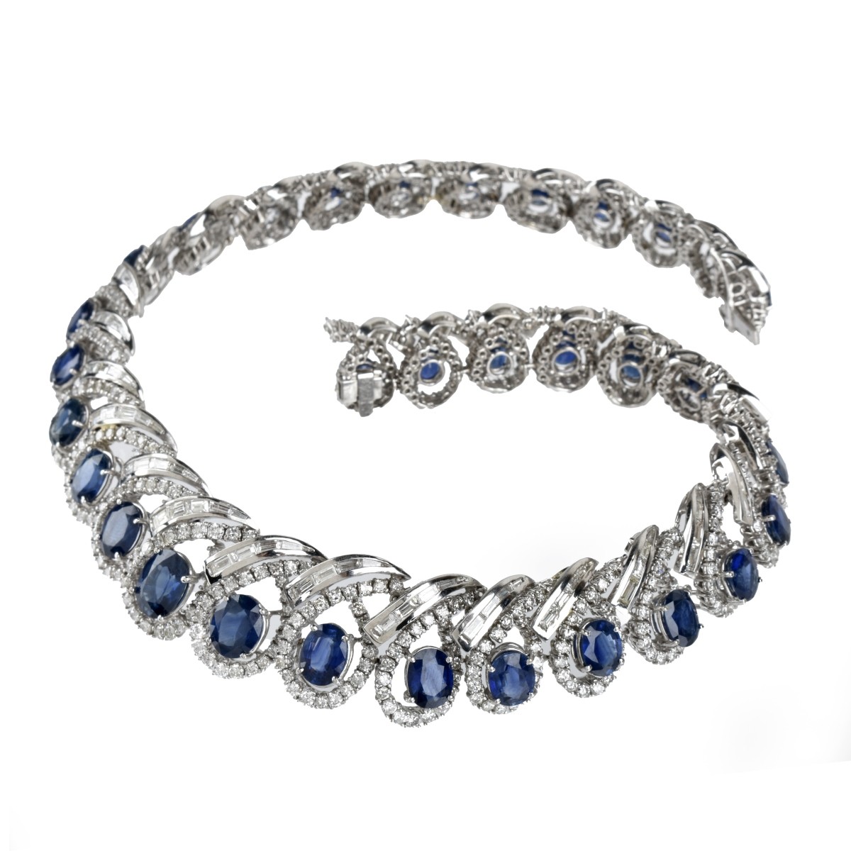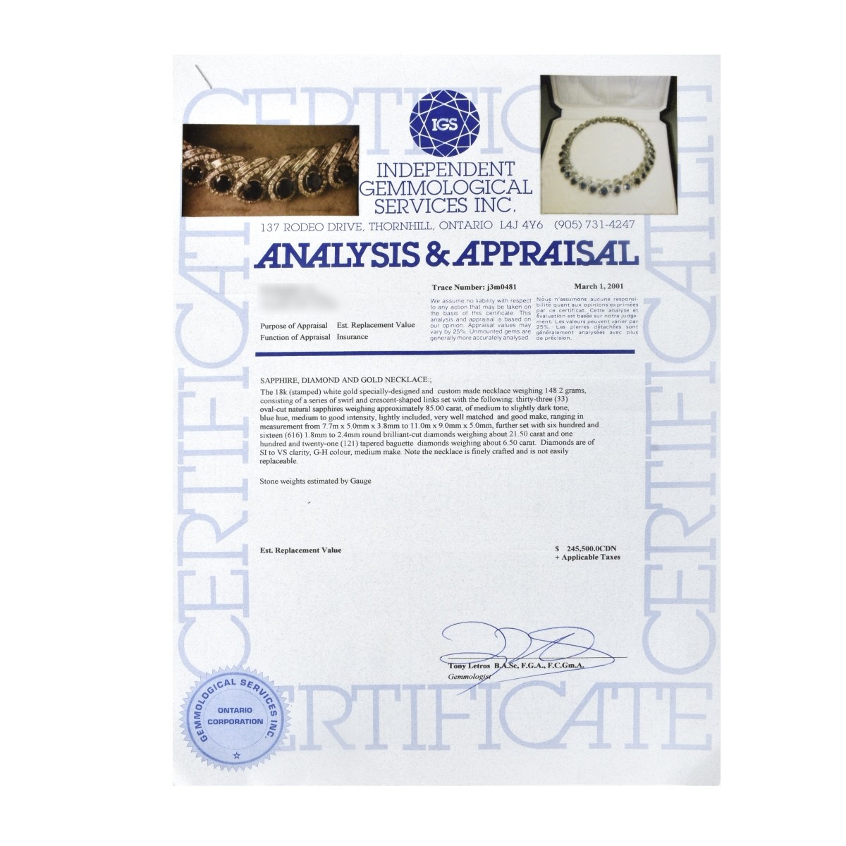 Important Vintage Custom Made Approx. 85.0 Carat TW Thirty-three Oval Cut Natural Sapphires, 28.0 Carat TW Seven Hundred Thirty-seven Round Brilliant and Tapered Baguette Cut Diamond and 18 Karat White Gold Necklace. Sapphires with vivid color and good clarity. Diamonds G-H color, VS-SI clarity. Stamped 18K. Measures 14-1/2" L. Approx. weight: 148.2 grams. Independent Gemmological Services Inc Analysis & Appraisal dated 3/1/2001 to accompany this Lot. Condition: Very good condition. Please refer to appraisal for details. For additional information and/or WhatsApp video please contact our resident GIA Graduate Gemologist, Russ Kodner at 954.650.5030 Estimate: $80,000.00 - $120,000.00 Domestic Shipping: Please inquire