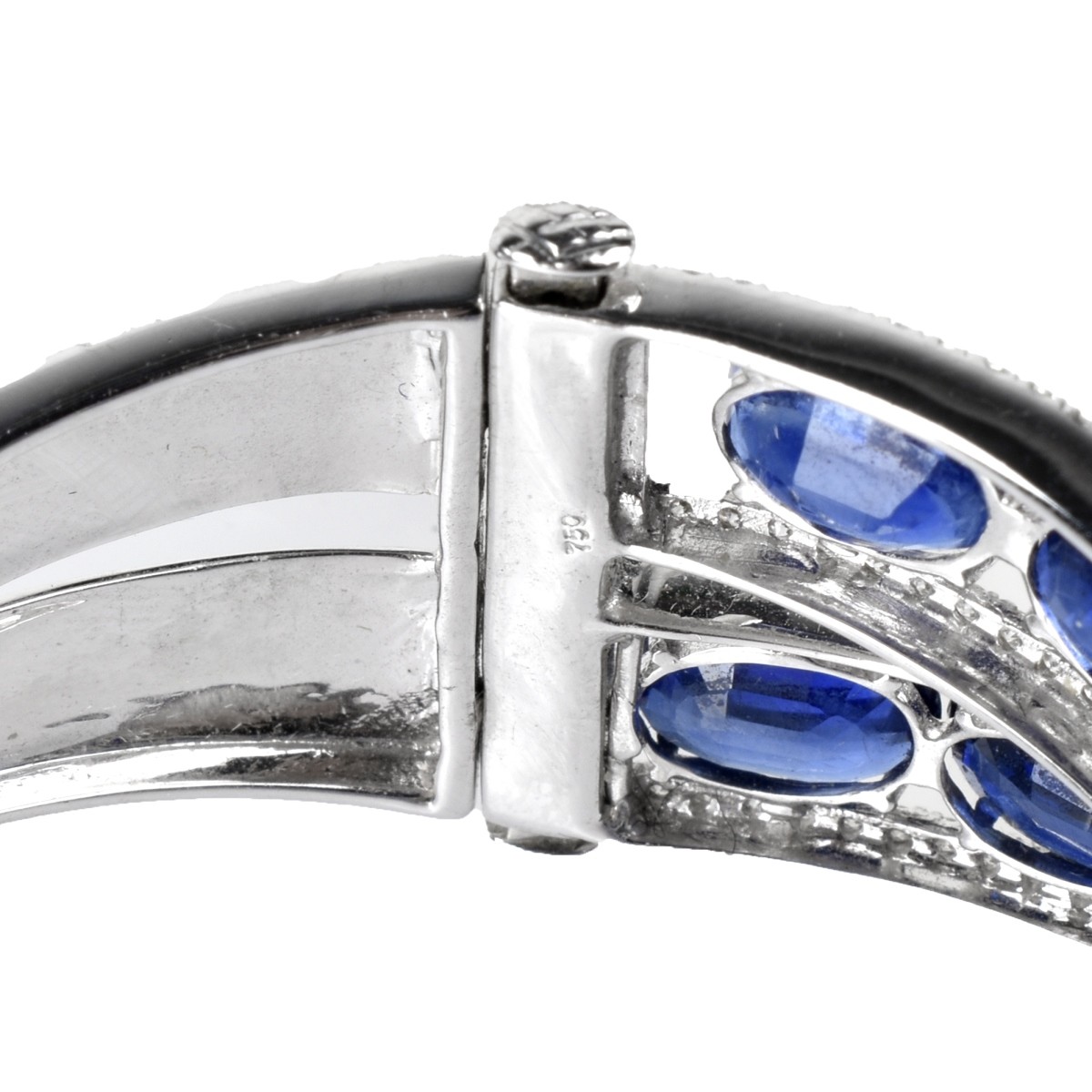 Approx. 40.0 Carat TW Twenty Oval Cut Ceylon Sapphire, 2.50 Carat TW Round Brilliant Diamond and 18 Karat White Gold Hinged Cuff Bangle Bracelet. Sapphires with very good color and clarity. Diamonds E-F Color, VS-S1 Clarity. Measures 6-1/2" interior circumference. Approx. weight: 39.55 grams. Condition: Good condition.For additional information and/or WhatsApp video please contact our resident GIA Graduate Gemologist, Russ Kodner at 954.650.5030 Estimate: $6000.00 - $8000.00 Domestic Shipping: $40.00