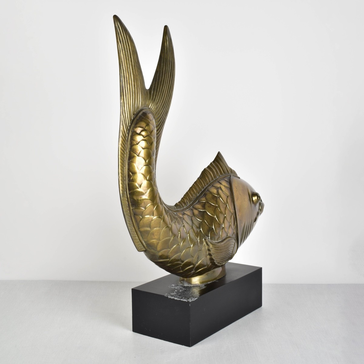 Brass Fish Sculpture on a Rectangular Metal Base. Original lable to bottom of base reading "1977 Chapman". Sculpture measures: 17" H, 18" W, 4" W. Condition: Good condition with slight oxidation to top surface of base. Estimate: $100.00 - $200.00 Domestic Shipping: Third party.