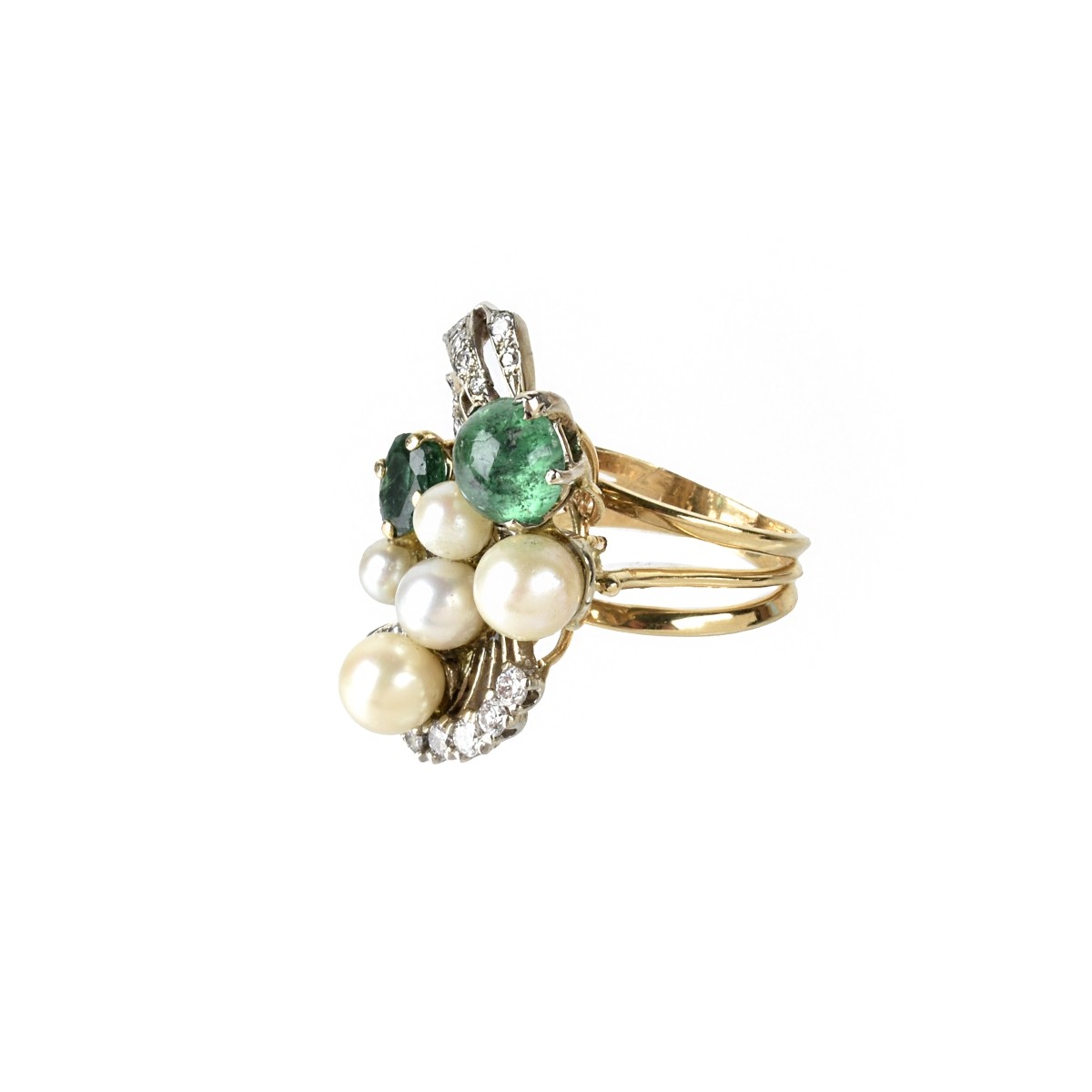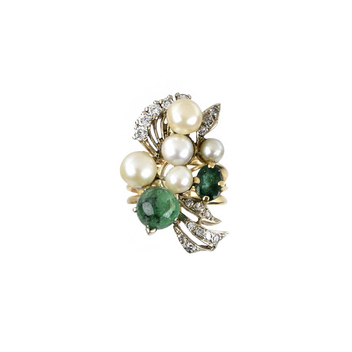 Antique Approx. 1.10 Carat Cabochon Emerald, Oval Cut Emerald, Approx. .65 Carat TW Round Brilliant Cut Diamond, Pearl and 14 Karat Yellow Gold Ring. Largest pearl measures 7mm. Diamonds G-H color, VS1-VS2 clarity. Ring size 6-1/4. Approx. weight: 10.68 grams. Kodner Galleries offers phone and absentee bidding at a low, flat 21% buyerís premium without surcharge or hidden fees. For information, please contact the gallery at info@kodner.com or 954.925.2550 Condition: Good vintage condition. For additional information and/or WhatsApp video please contact our resident GIA Graduate Gemologist, Russ Kodner at 954.650.5030 Estimate: $800.00 - $1200.00 Domestic Shipping: $40.00