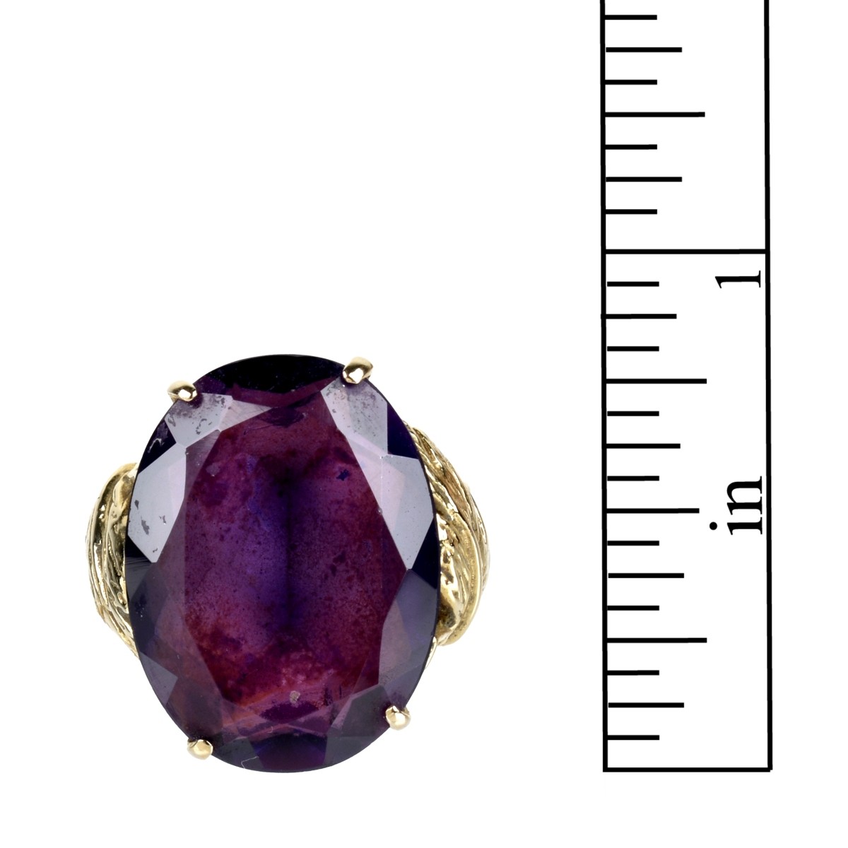 Large Vintage Oval Cut Amethyst and 14 Karat Yellow Gold Ring. Amethyst with good color and clarity, measures 20 x 14mm. Ring size 5. Approx. weight: 9.06 grams. Kodner Galleries offers phone and absentee bidding at a low, flat 21% buyerís premium without surcharge or hidden fees. For information, please contact the gallery at info@kodner.com or 954.925.2550 Condition: Good vintage condition. Needs cleaning. Estimate: $100.00 - $200.00 Domestic Shipping: $40.00