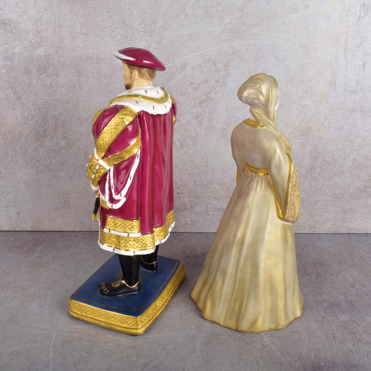Two (2) Royal Worcester Porcelain Figurines Tudor King "Henry VIII" and "Anne Boleyn". Circa 1970. Properly marked to the bottom. Henry VIII measures: 9-1/2" H, 4-1/2", 3-1/4" D. Kodner Galleries offers phone and absentee bidding at a low, flat 21% buyerís premium without surcharge or hidden fees. For information, please contact the gallery at info@kodner.com or 954.925.2550 Condition: Good condition. Estimate: $250.00 - $400.00 Domestic Shipping: $78.00