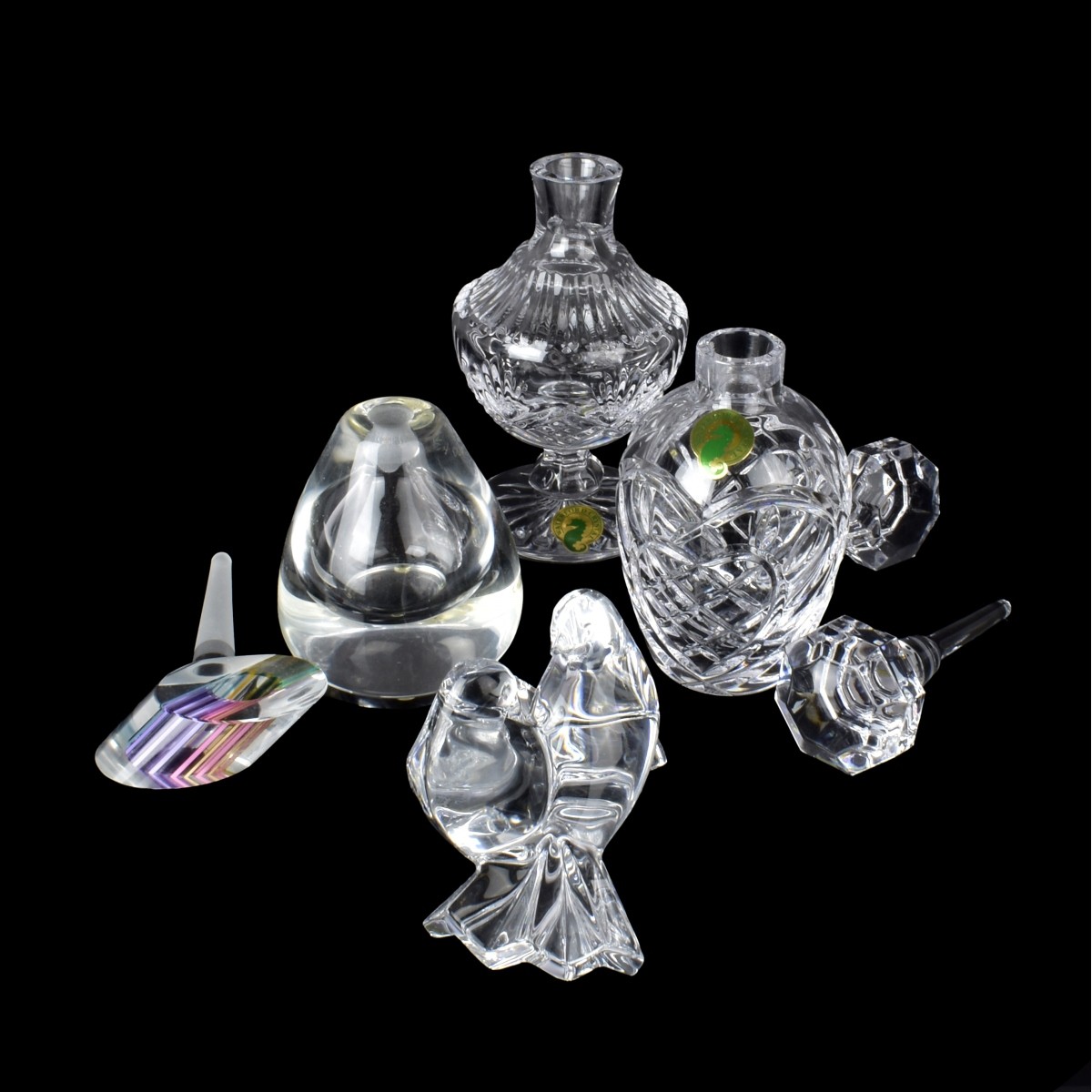 Collection of Four (4) Modern Crystal Art Glass Pieces. Consisting of one (1) Waterford "Lismore" perfume bottle, properly marked to the bottom, one (1) Waterford perfume bottle, properly marked to the bottom, one (1) perfume bottle with multi colored bands through the stopper, signed and one (1) Baccarat crystal figurine of lovebirds, properly marked to the bottom. "Lismore" perfume bottle measures: 6-1/4" H, 3" Dia, lovebirds measure: 2-1/4" H, 4" W, 2-1/2" D. Kodner Galleries offers phone and absentee bidding at a low, flat 21% buyerís premium without surcharge or hidden fees. For information, please contact the gallery at info@kodner.com or 954.925.2550 Condition: Good condition. Estimate: $100.00 - $150.00 Domestic Shipping: $92.00
