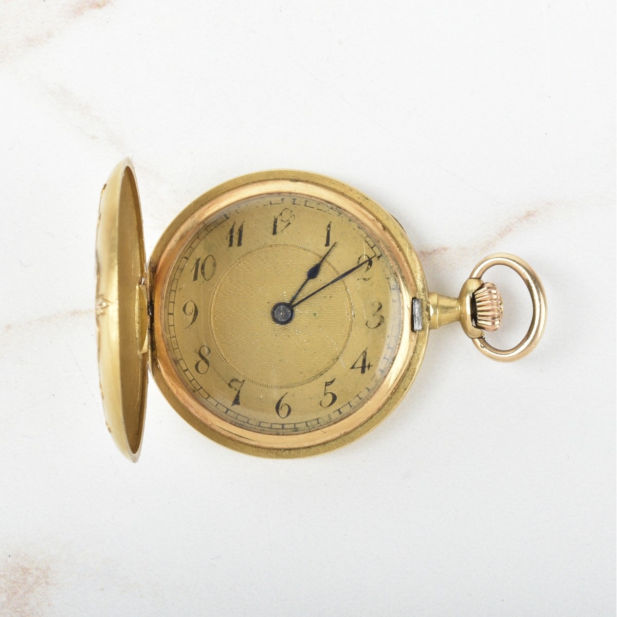 Lady's Antique Delicate 18 Karat Yellow Gold Pocket Watch. Case with love birds and scroll design accented with small diamonds. Case measures 30mm. Manual wind movement. Case interior stamped 18K. Approx. gross weight: 18.96 grams. Kodner Galleries offers phone and absentee bidding at a low, flat 21% buyerís premium without surcharge or hidden fees. For information, please contact the gallery at info@kodner.com or 954.925.2550 Condition: Good antique condition. Not running. Please note the gallery does not warranty the running condition of watches. Estimate: $600.00 - $800.00 Domestic Shipping: $40.00