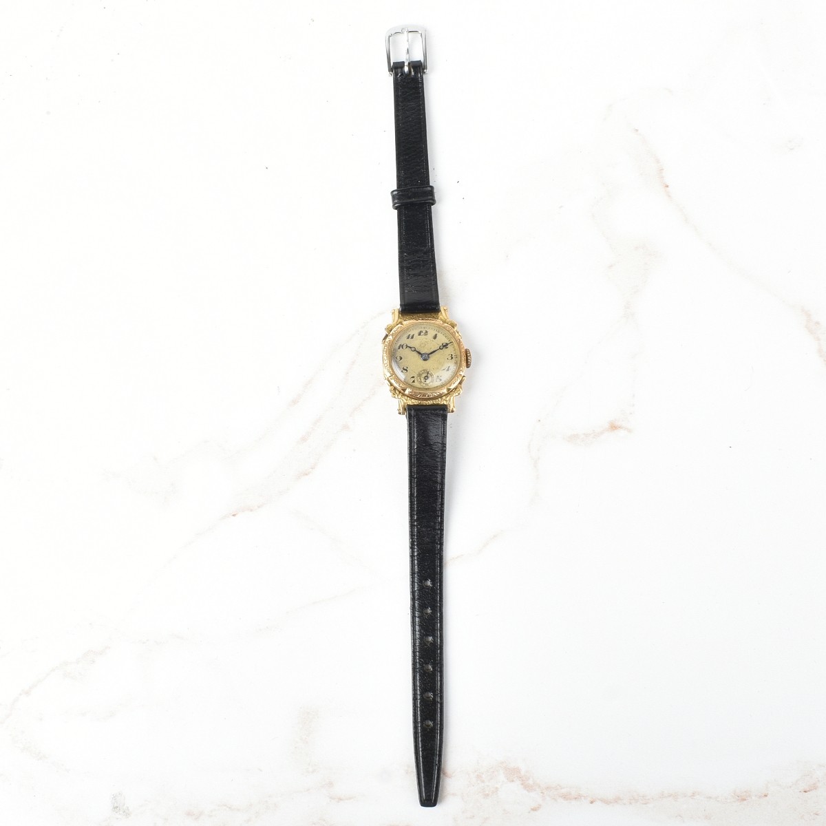 Lady's Antique 19th Century Engraved 14 Karat Yellow Gold Watch, Leather Strap Bracelet. Manual wind movement. Possibly made for Russian market. Case measures 21mm. Bracelet measures 7-1/2" L. Approx. gross weight: 12.0 grams. Kodner Galleries offers phone and absentee bidding at a low, flat 21% buyerís premium without surcharge or hidden fees. For information, please contact the gallery at info@kodner.com or 954.925.2550 Condition: Antique condition. Not running. Please note the gallery does not warranty the running condition of watches. Estimate: $300.00 - $500.00 Domestic Shipping: $40.00