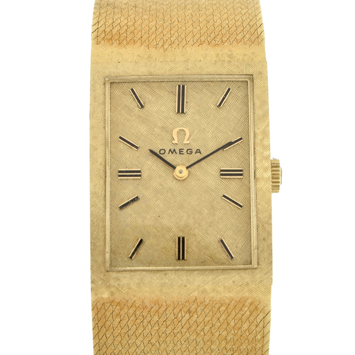 Man's Vintage Omega 14 Karat Yellow Gold Integrated Bracelet Watch. Manual wind movement. Case back and clasp stamped 14K. Case measures 28 x 21.5mm; bracelet measures 7-1/4" L. Approx. gross weight: 57.41 grams. With original box. Kodner Galleries offers phone and absentee bidding at a low, flat 21% buyerís premium without surcharge or hidden fees. For information, please contact the gallery at info@kodner.com or 954.925.2550 Condition: Appears to need servicing. Not running. Otherwise good vintage condition. Please note the gallery does not warranty the running condition of watches. For additional information and/or WhatsApp video please contact our resident GIA Graduate Gemologist, Russ Kodner at 954.650.5030 Estimate: $1500.00 - 2000.00 Domestic Shipping: $48.00