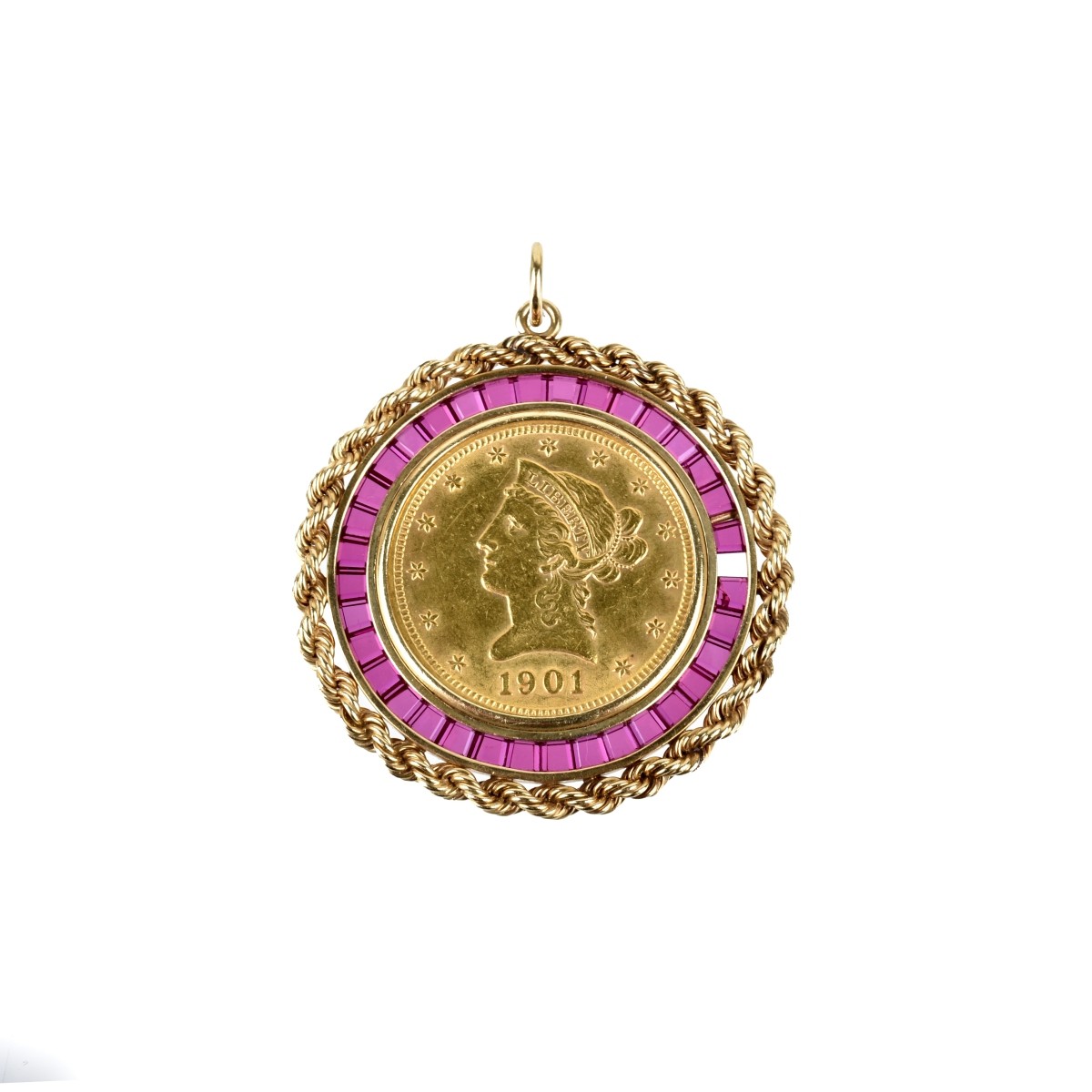 1901 US $10 Coronet Head Gold Eagle Coin set as a Pendant in 14 Karat Yellow Gold and Accented with Lab Made Rubies. Measures 2" L, 1-5/8" W. Approx. total weight: 28.25 grams. Kodner Galleries offers phone and absentee bidding at a low, flat 21% buyerís premium without surcharge or hidden fees. For information, please contact the gallery at info@kodner.com or 954.925.2550 Condition: Very good condition. Coin is not professionally graded. For additional information and/or WhatsApp video please contact our resident GIA Graduate Gemologist, Russ Kodner at 954.650.5030 Estimate: $2000.00 - $3000.00 Domestic Shipping: $40.00