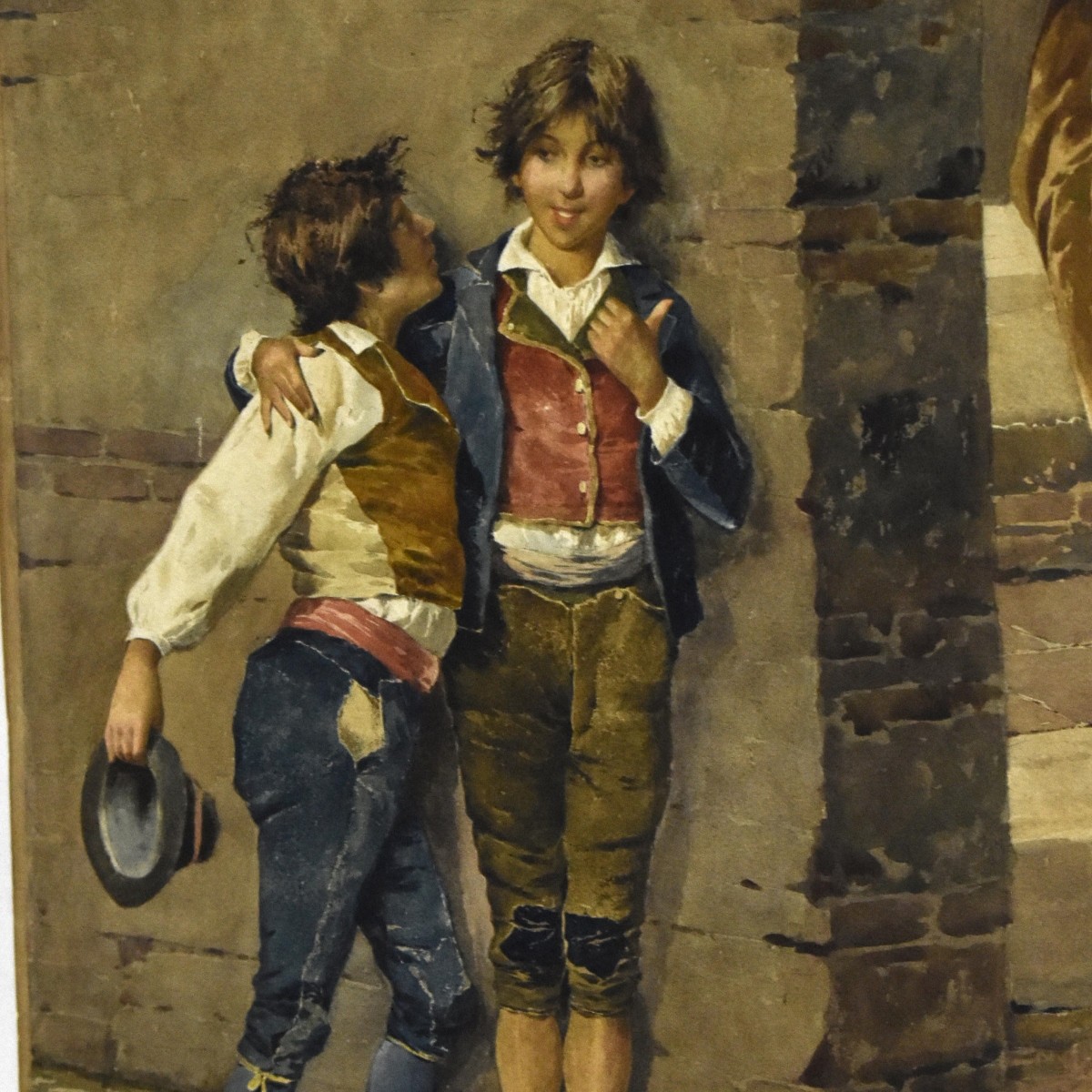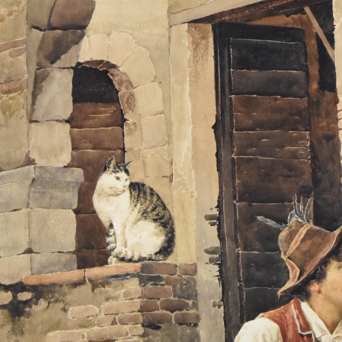 Filippo Indoni, Italian (1842-1908) Watercolor on Paper Mounted to Paperboard, Unframed . A scene of a woman with a spool of yarn with a man helping her and two (2) young children talking next to a wall and a cat perched on the wall looking down. Artist signed bottom left hand corner. Measures: 40-1/2" H, 27" W. Kodner Galleries offers phone and absentee bidding at a low, flat 21% buyerís premium without surcharge or hidden fees. For information, please contact the gallery at info@kodner.com or 954.925.2550 Condition: Good condition, back has slight water damage and one edge bent and would not be visible when set in a frame. Estimate: $400.00 - $800.00 Domestic Shipping: Third party
