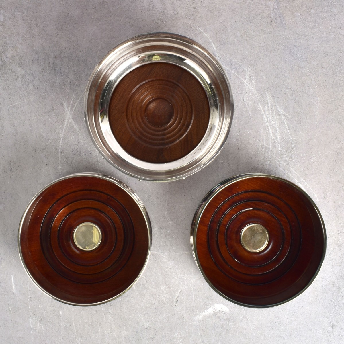 Three (3) English 925 Sterling Silver Wine Coasters with Rosewood Bottoms. Two (2) by one maker, one (1) by another maker. Properly marked to the bottoms. Largest measures: 2-1/4" H., 5-1/2" Dia. All properly stamped. Total approximate gross weight: troy 18.38 ounces. Kodner Galleries offers phone and absentee bidding at a low, flat 21% buyerís premium without surcharge or hidden fees. For information, please contact the gallery at info@kodner.com or 954.925.2550 Condition: Good condition. Estimate: $150.00 - $300.00 Domestic Shipping: $49.00