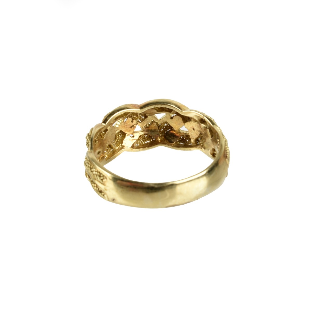 Vintage 18 Karat Yellow Gold. Stamped 18K. Ring size 10-1/2. Approx. weight: 6.32 grams. Kodner Galleries offers phone and absentee bidding at a low, flat 21% buyerís premium without surcharge or hidden fees. For information, please contact the gallery at info@kodner.com or 954.925.2550 Condition: Good vintage condition. For additional information and/or WhatsApp video please contact our resident GIA Graduate Gemologist, Russ Kodner at 954.650.5030 Estimate: $600.00 - $800.00 Domestic Shipping: $40.00