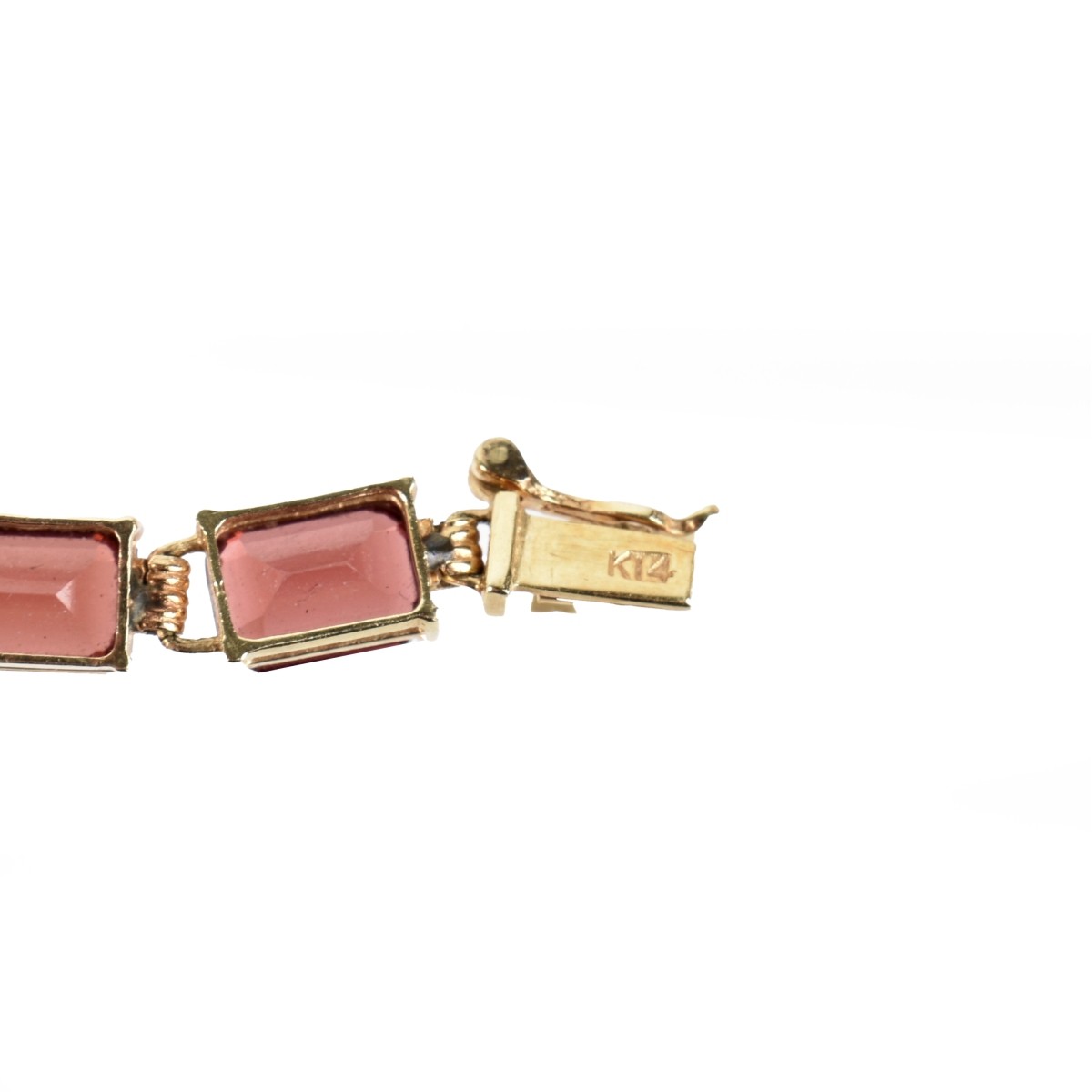 Vintage Eighteen Emerald Cut Garnet and 14 Karat Yellow Gold Bracelet. Garnets with good color and clarity. Clasp stamped 14K. Measures 7" L. Approx. weight: 10.24 grams. Kodner Galleries offers phone and absentee bidding at a low, flat 21% buyerís premium without surcharge or hidden fees. For information, please contact the gallery at info@kodner.com or 954.925.2550 Condition: Very good condition. Estimate: $700.00 - $900.00 Domestic Shipping: $40.00
