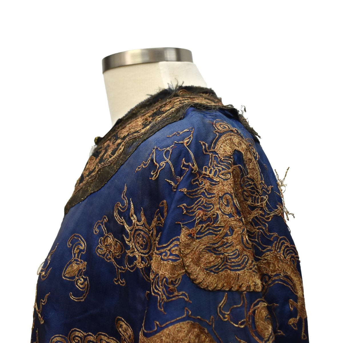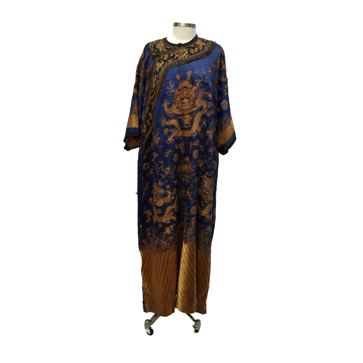 Chinese Multi-Colored Blue Silk Embroidered Robe. Decorated with the Five (5) Clawed Imperial Dragon. 18/19th century. Size: Medium. Kodner Galleries offers phone and absentee bidding at a low, flat 21% buyerís premium without surcharge or hidden fees. For information, please contact the gallery at info@kodner.com or 954.925.2550 Condition: Good antique condition, some loose threads. Some minor fraying, commensurate with age. Estimate: $2000.00 - $3000.00 Domestic Shipping: $125.00