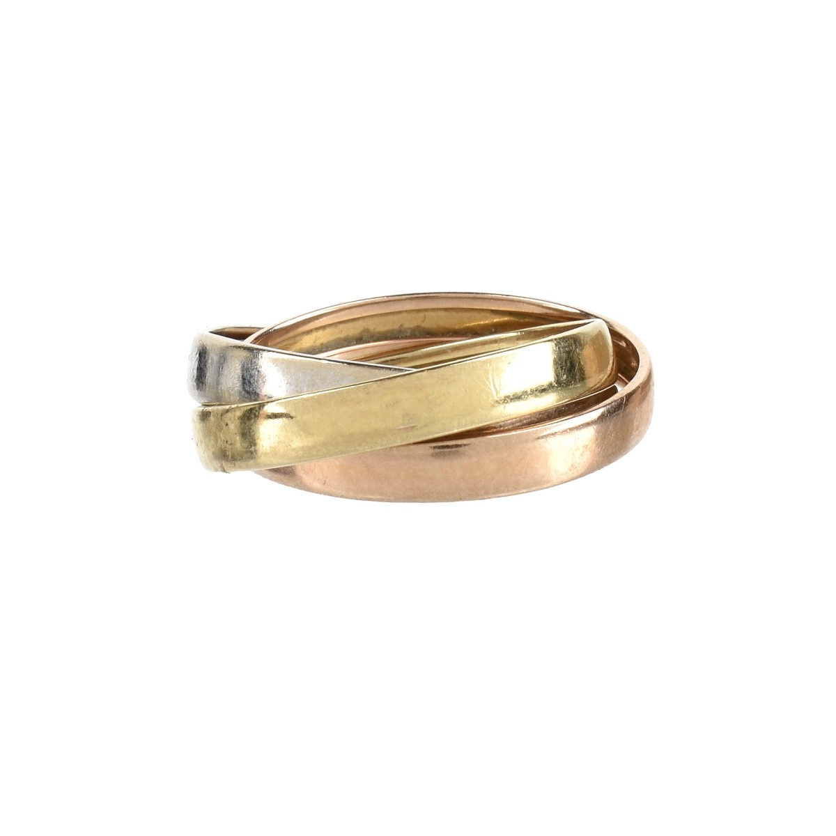 Vintage Italian Cartier style 14 Karat Tri-color "Trinity" Ring. Stamped Italy 14K. Ring size 6. Approx. weight: 3.22 grams. Kodner Galleries offers phone and absentee bidding at a low, flat 21% buyerís premium without surcharge or hidden fees. For information, please contact the gallery at info@kodner.com or 954.925.2550 Condition: Good vintage condition. Light surface wear from normal use. Estimate: $200.00 - $400.00 Domestic Shipping: $40.00