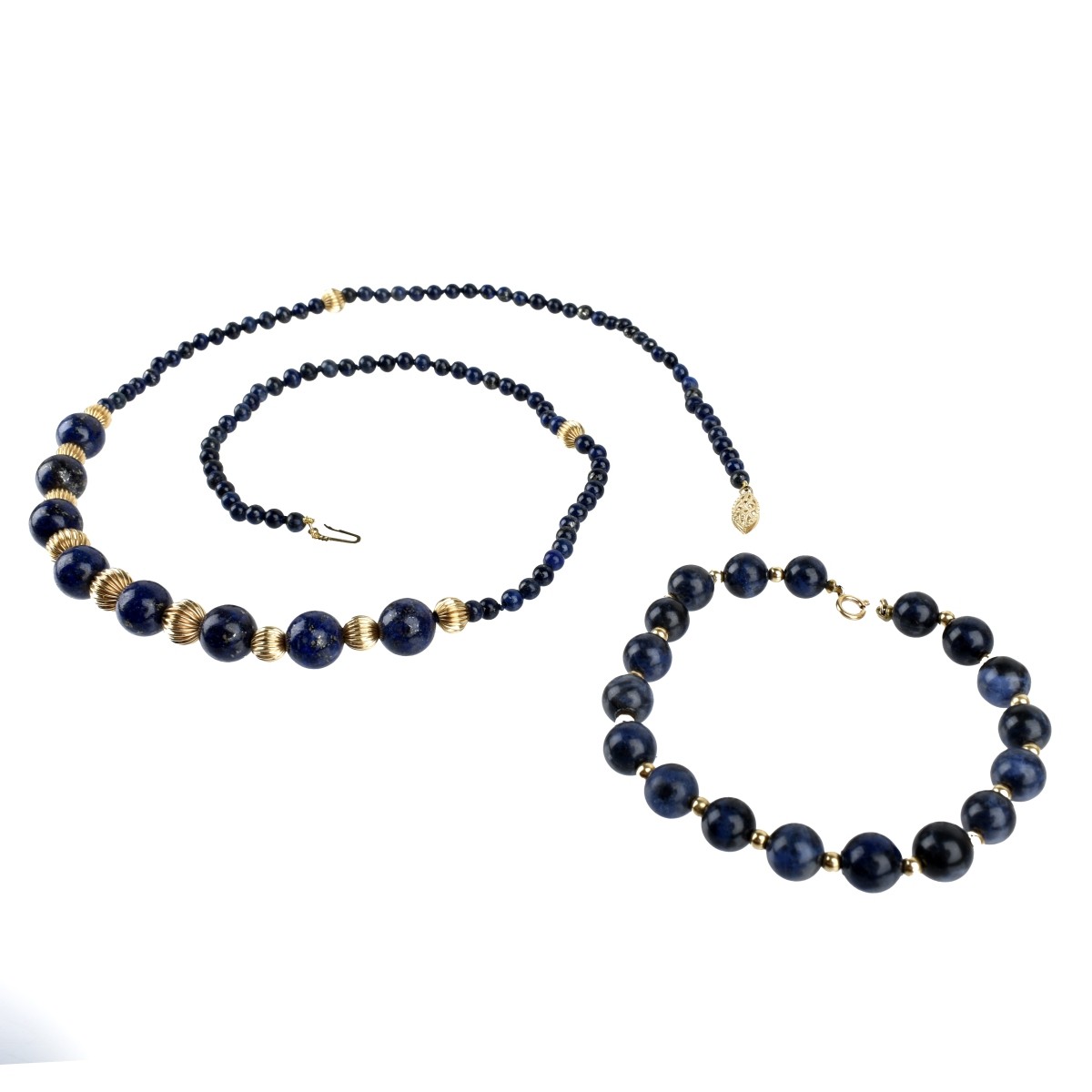 Vintage Lapis Lazuli Bead and 14 Karat Yellow Gold Bead Necklace and Bracelet. Lapis bead measures 4-10mm. Largest gold beads measure 8mm. Clasp stamped 14K. Necklace measures 23" L; bracelet measures 7-5/8" L. Approx. total weight: 34.83 grams. Kodner Galleries offers phone and absentee bidding at a low, flat 21% buyerís premium without surcharge or hidden fees. For information, please contact the gallery at info@kodner.com or 954.925.2550 Condition: Very good vintage condition. Estimate: $200.00 - $400.00 Domestic Shipping: $40.00