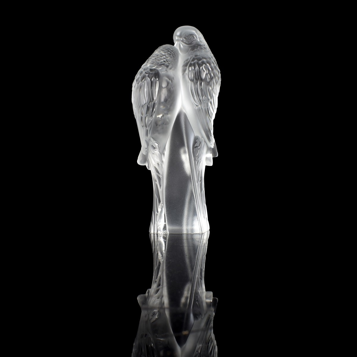 Lalique Figurine of Parakeets Perched on a Tree Stump in Frosted and Clear Glass. Properly signed to the bottom. Measures: 7" H., 3-1/4" W., 2-1/8" D. Kodner Galleries offers phone and absentee bidding at a low, flat 21% buyerís premium without surcharge or hidden fees. For information, please contact the gallery at info@kodner.com or 954.925.2550 Condition: Chip to bottom corner. Estimate: $50.00 - $100.00 Domestic Shipping: $58.00