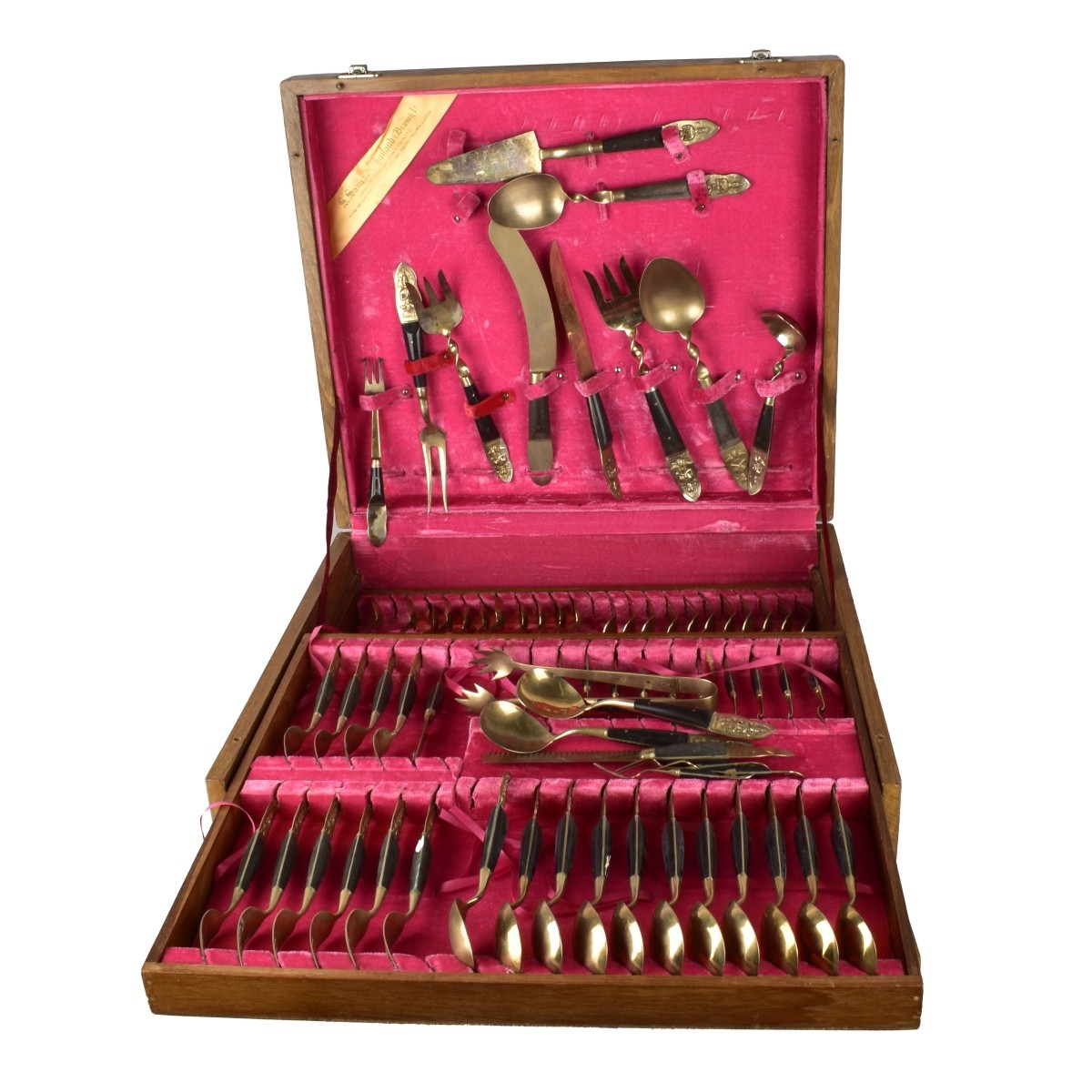 Vintage Thai Bronze and Wood Flatware Set. Consisting of 143 pieces in wooden box, Service for 12 people, less one fork, one spoon, one small fork. Box for display only. Kodner Galleries offers phone and absentee bidding at a low, flat 21% buyerís premium without surcharge or hidden fees. For information, please contact the gallery at info@kodner.com or 954.925.2550 Condition: Overall good vintage condition. We did not examine each piece in detail. Estimate: $100.00 - $200.000 Domestic Shipping: Third party.