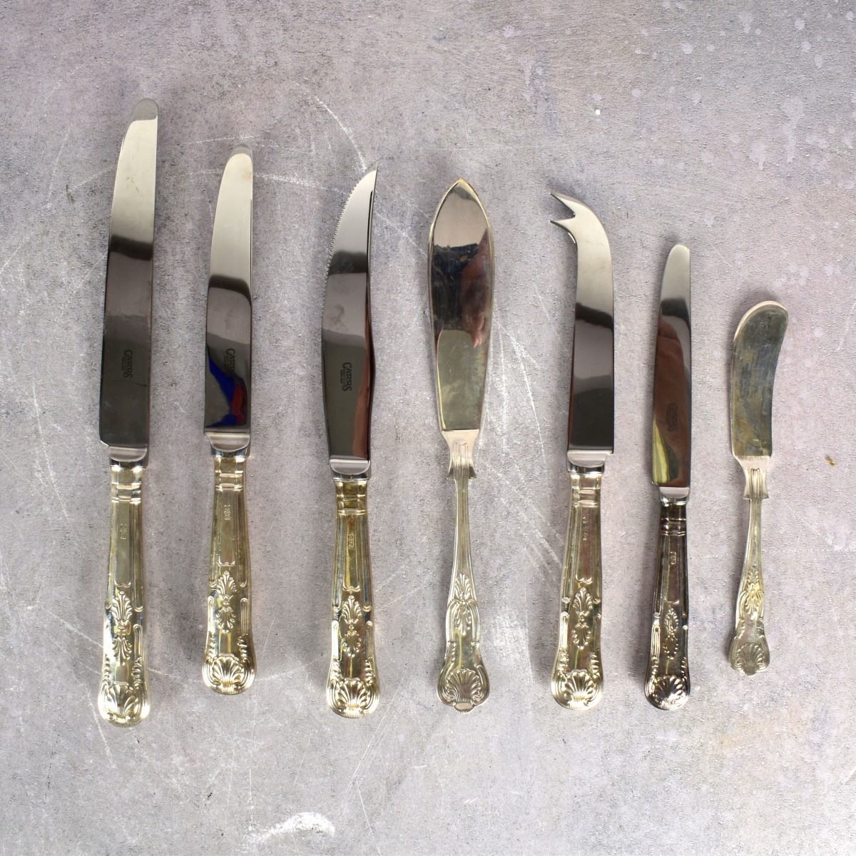 Robert Carr English Two hundred-fifteen (215) Piece Sterling Silver Flatware in the "Kings" Pattern with a Shell and Floral Design. Not monogrammed. Consisting of: 12 dinner knives, measure: 9-3/4" L., 12 luncheon knives, measure: 8-3/4" L., 12 dessert forks, measure: 7-1/4" L., 12 steak knives, measure: 8-1/2" L., 12 fish knives, measure: 8-1/8" L., 6 butter spreaders, measure: 6" L., 2 cheese knives, measure: 8" L., 2 cheese spreaders, measure: 8" L., 12 dinner forks, measure: 8-1/4" L., 12 salad forks, measure: 6-7/8" L., 12 luncheon forks, measure: 7-1/4" L., 12 cake forks, measure: 5-1/2" L., 12 tea forks, measure: 5-1/2" L., 12 cream soup spoons, measure: 7" L., 12 soup spoons, measure: 7-1/8" L., 12 tea spoons, measure: 6" L., 12 five o'clock spoons, measure: 5-1/4" L., 12 espresso spoons, measure: 4-5/8" L. with twenty-five (25) various serving pieces, longest carving knife measures: 14-3/4" L. Total approximate gross weight: 419.43 troy ounces, total weight of sterling silver pieces only: 310.03 troy ounces. Box for display purposes only. Kodner Galleries offers phone and absentee bidding at a low, flat 21% buyerís premium without surcharge or hidden fees. For information, please contact the gallery at info@kodner.com or 954.925.2550 Condition: Very good condition. Estimate: $6000.00 - $10000 Domestic Shipping: Third party.