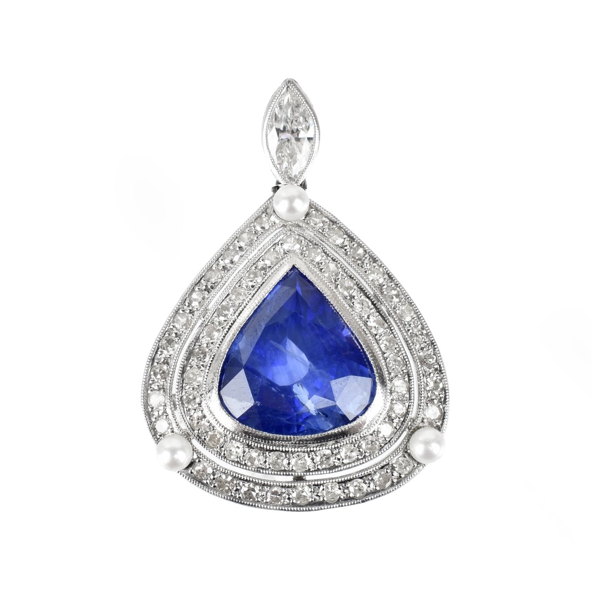GIA Certified 12.05 Pear Shape Natural Sapphire and 18 Karat White Gold Pendant Brooch. Accented with a .75 carat marquise cut Diamond and further accented with numerous round cut diamonds and three small pearls. Diamonds F-G color, VS1-SI1 clarity. Stamped 18K, 750. Measures 1-1/2" L, 1" W. Approx. weight: 11.37 grams. GIA Report 5232543649 dated 4/3/2025 to accompany this Lot. Kodner Galleries offers phone and absentee bidding at a low, flat 21% buyerís premium without surcharge or hidden fees. For information, please contact the gallery at info@kodner.com or 954.925.2550 Condition: Very good condition. Please refer to GIA report. For additional information and/or WhatsApp video please contact our resident GIA Graduate Gemologist, Russ Kodner at 954.650.5030 Estimate: $16,000.00 - $20,000.00 Domestic Shipping: $42.00