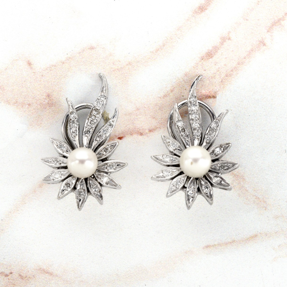 Vintage Pair of 6mm Pearl, Small Round Cut Diamond and 14 Karat White Gold Flower Ear Clips. Pearls with good luster and polish. Diamonds G-H color, VS clarity. Measure 1-1/8" L, 3/4" W. Approx. total weight: 9.22 grams. Kodner Galleries offers phone and absentee bidding at a low, flat 21% buyerís premium without surcharge or hidden fees. For information, please contact the gallery at info@kodner.com or 954.925.2550 Condition: Good vintage condition. Estimate: $300.00 - $400.00 Domestic Shipping: $40.00